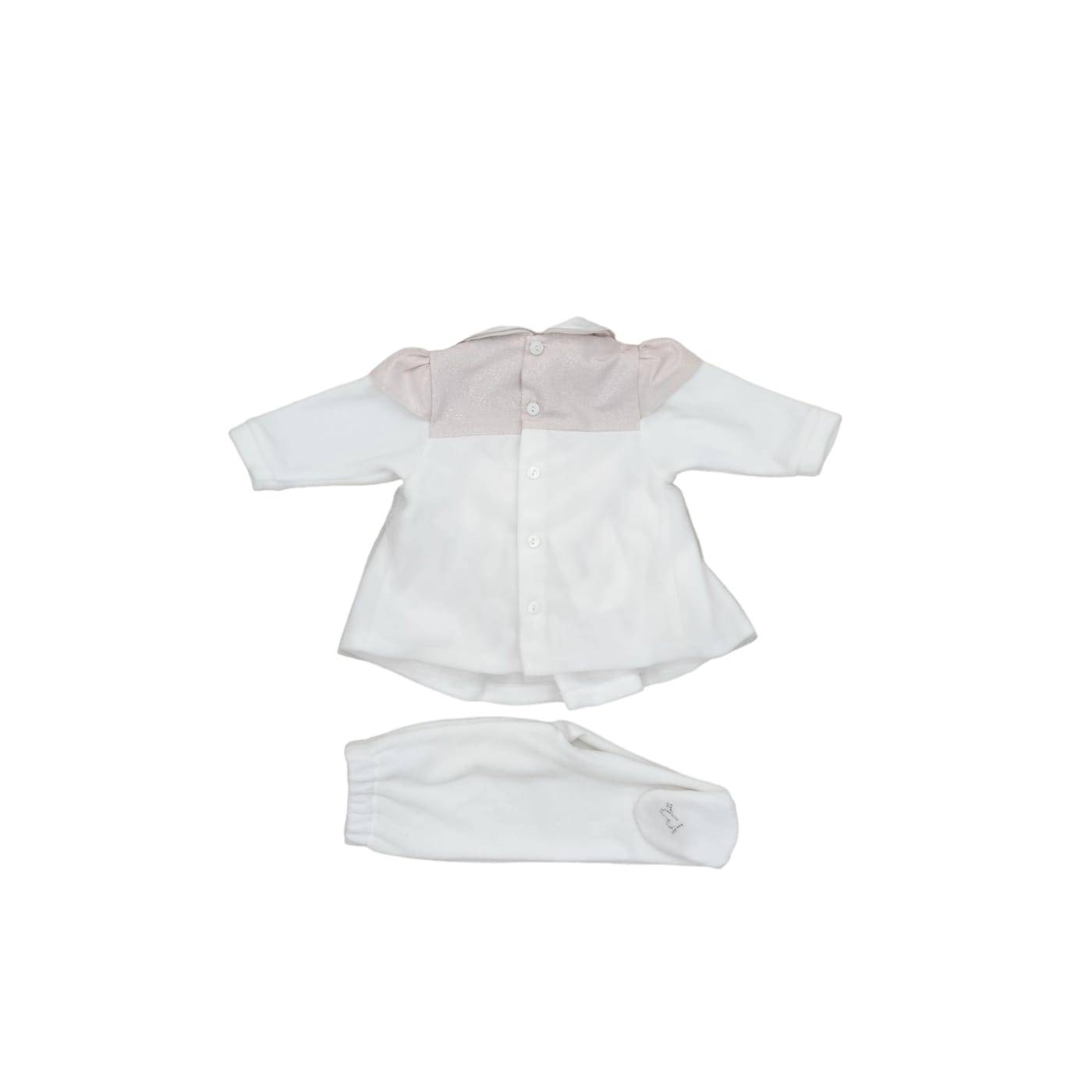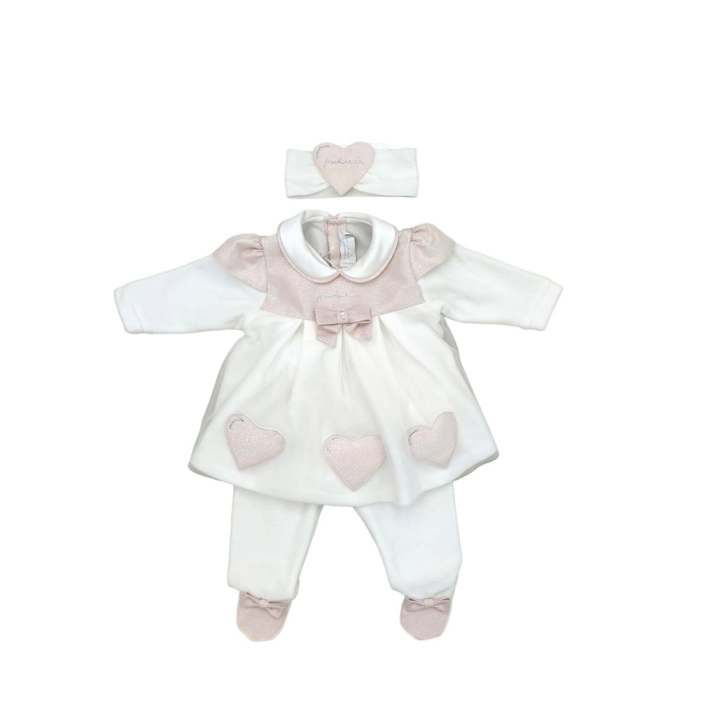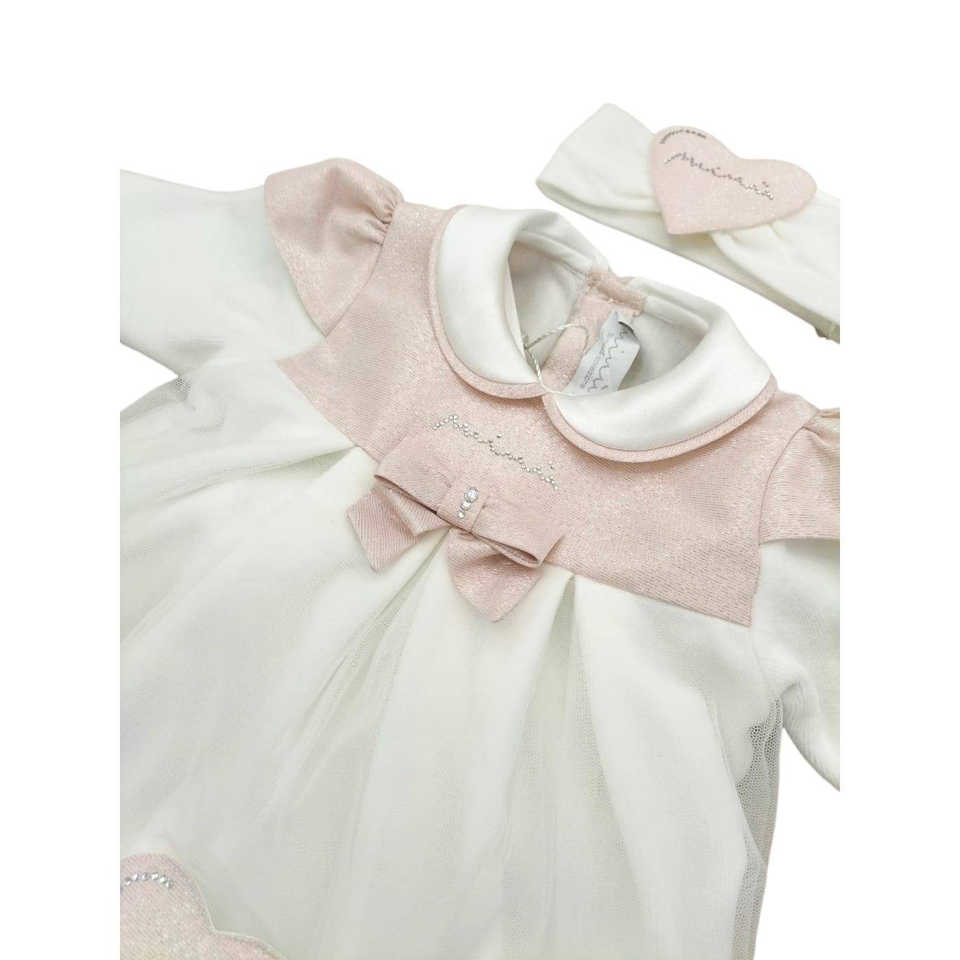 An elegant 2-piece (dress with ghettina) coverlet from the brand Minù with a white chenille base and details made of pink silk shantung with a laminated effect. The little hearts are set on a multilayer tulle base, making this clinic outfit more elegant and refined. Suitable for spring as well as autumn and winter. Size 1 month corresponding to 50/58 centimetres.