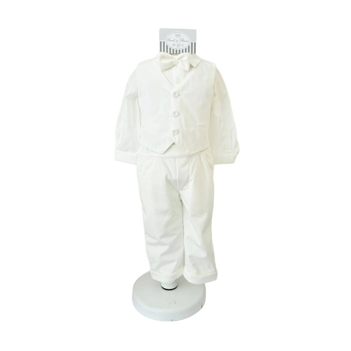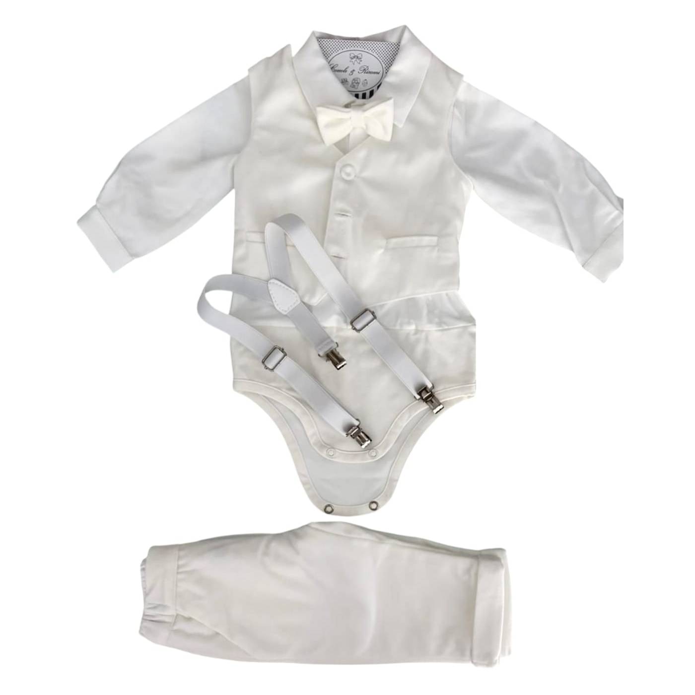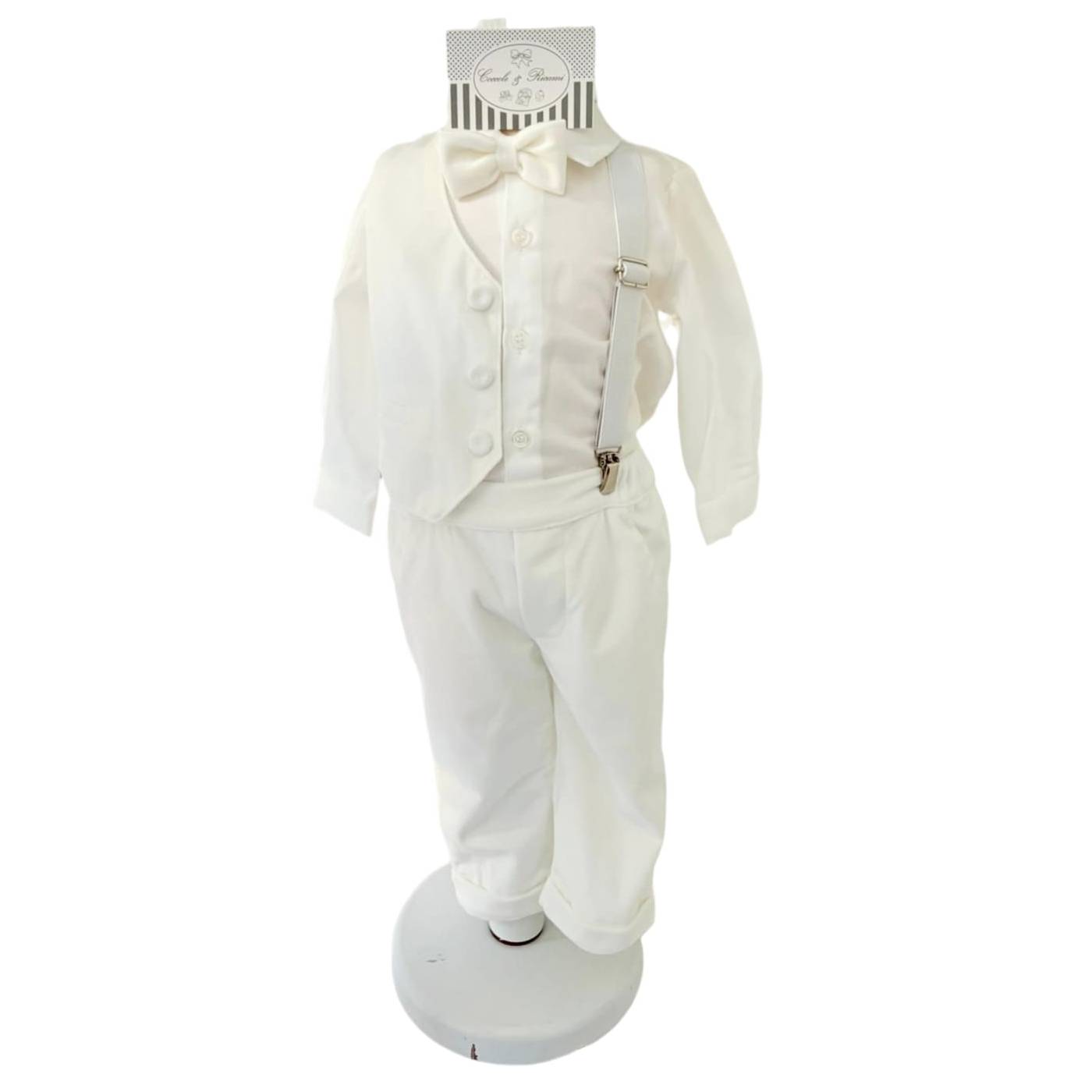 With this outfit from the brand Minù your child will be wrapped in the highest quality fabrics as well as being elegant, comfortable and original at the same time. Composed of 4 pieces: white blouse in pure cotton with the possibility of turning the sleeves and fastening them with a button; white and light blue bow tie; waistcoat with light blue weave on the front side and white on the back side; Bermuda shorts with braces in milk white silk satin. Ideal for mothers looking for light colours for their christening day. Suitable for both ceremonies and christenings in high summer.