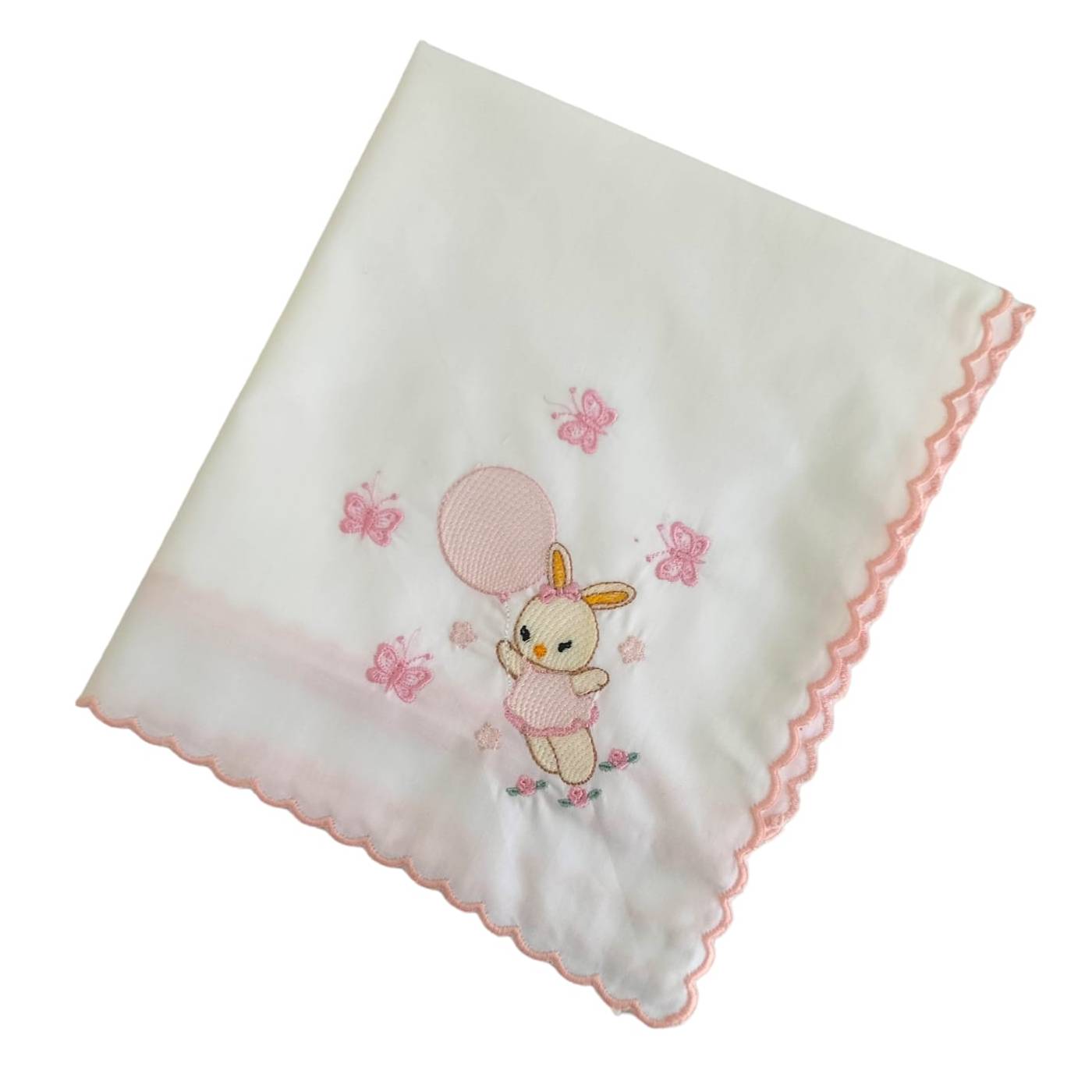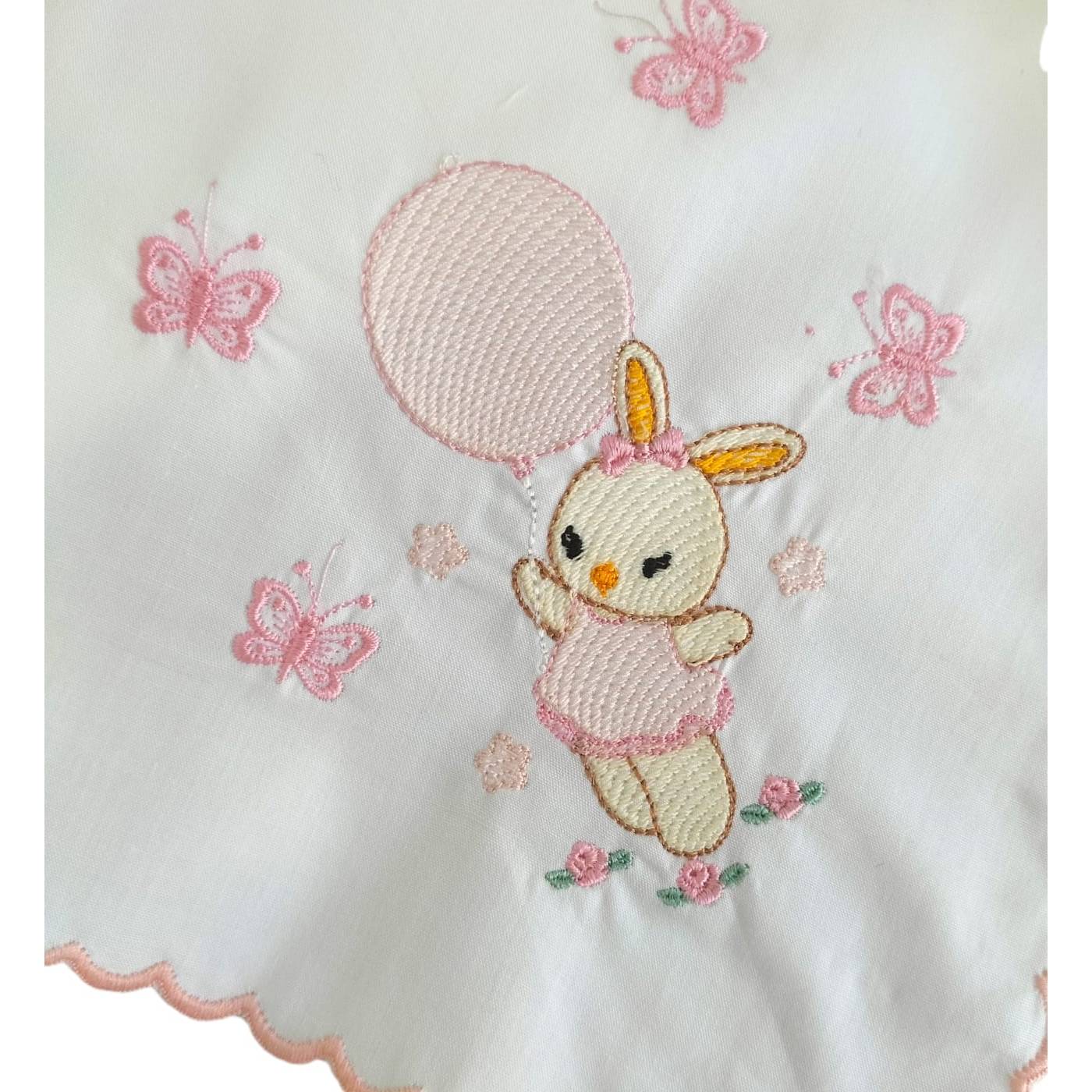 Square in white cotton batiste edged with pink emery and embroidered with a sweet little bunny in the company of little butterflies on one corner. Being made of organic cotton they are extremely soft on baby's delicate skin, breathable and absorbent. Useful from the baby's first hours of life and with multiple uses: for breastfeeding; as a summer sheet; to dry the baby's face, hands... after bath time; in summer for car seats and pushchairs; to rest on the mother's shoulder when burping...