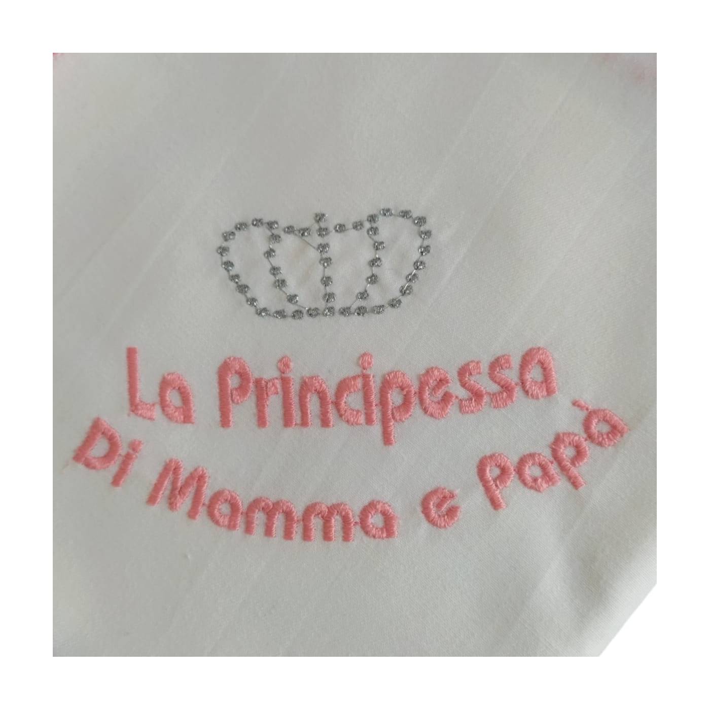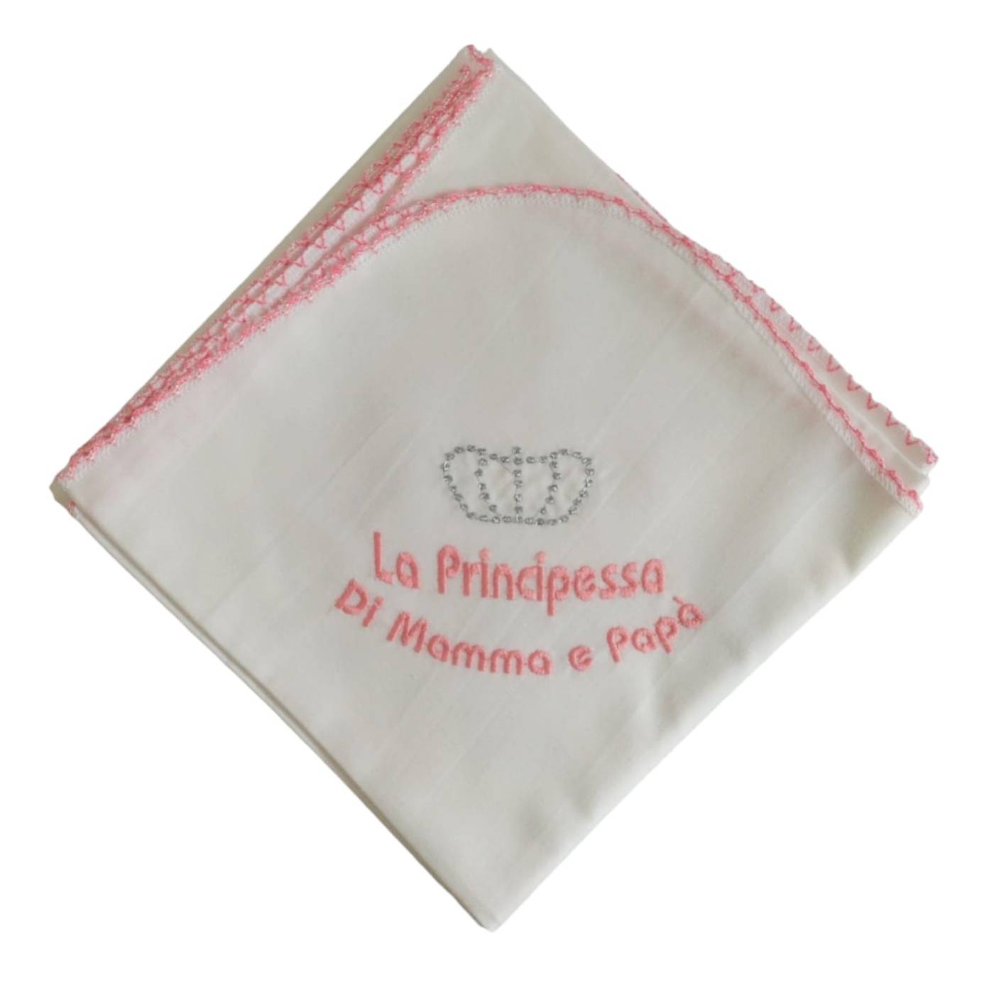 White cotton batiste square with pink embroidery 'Mummy and Daddy's Princess' on one corner. Being made of organic cotton they are soft on baby's delicate skin, breathable and absorbent. Useful from the baby's first hours of life and with multiple uses: for breastfeeding; as a summer sheet; to dry the baby's face, hands... after bath time; in summer for car seats and pushchairs; to rest on the mother's shoulder when burping...