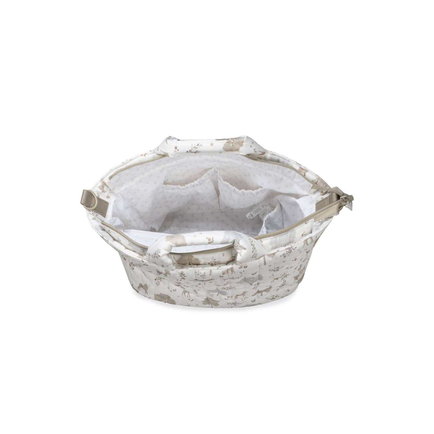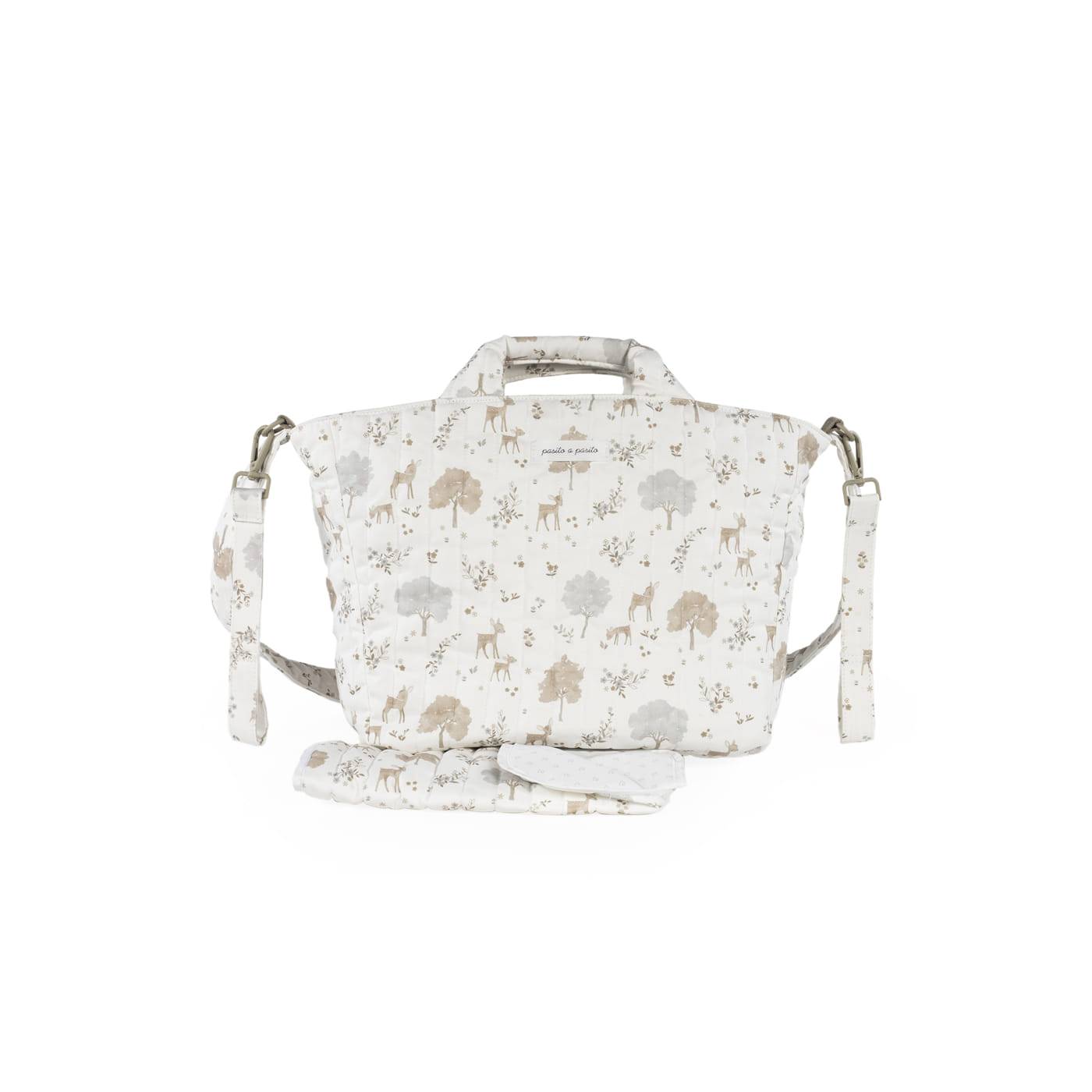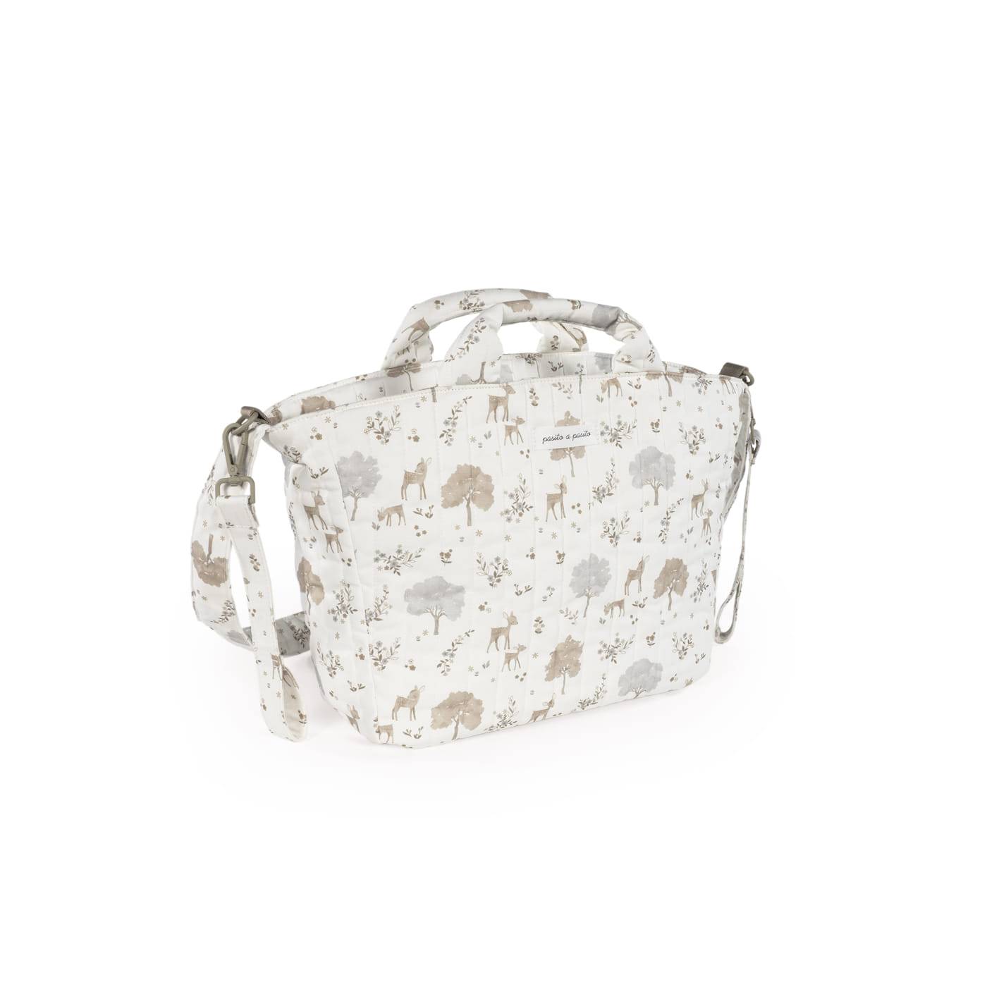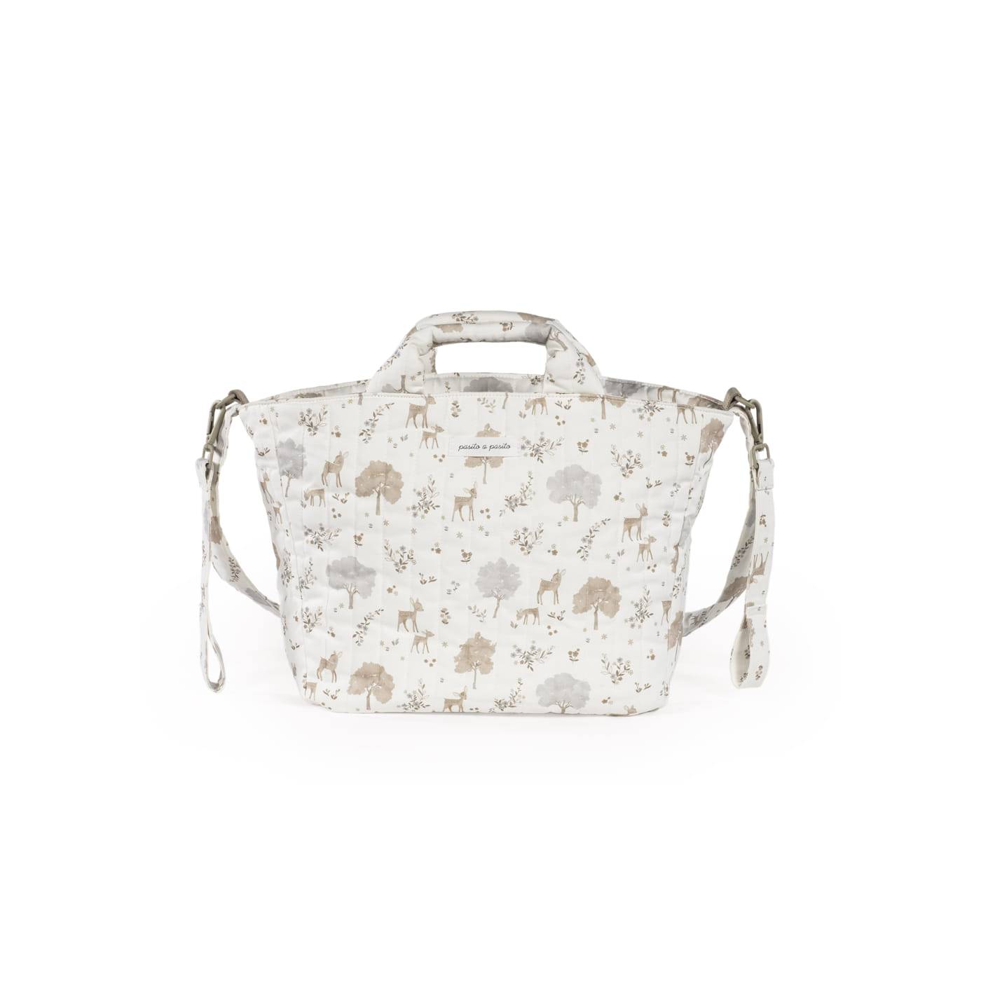 Pasito a Pasito's Nara changing bag is a unique model made of 100% cotton canvas with a delicate deer and tree print in neutral shades. The waterproof treatment makes it water-resistant, ensuring protection and durability for everyday use. It is an elegant and practical design with a large capacity that allows you to carry everything you need. It has a double handle, a long one for carrying it on the shoulder and two shorter ones for carrying it by hand, as well as additional universal straps for attaching it to the pram.