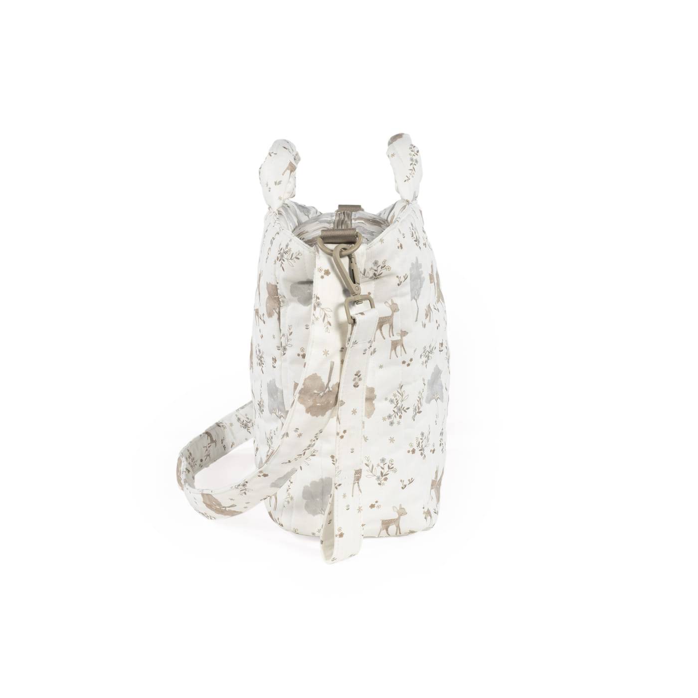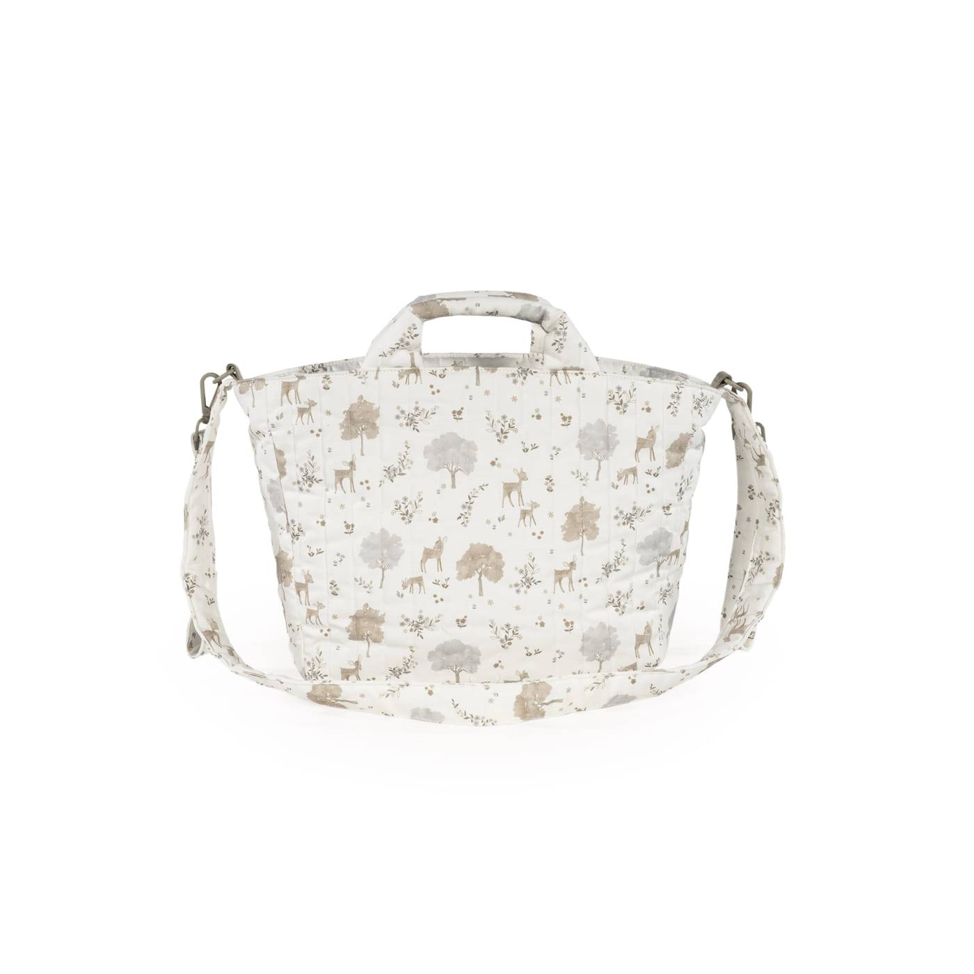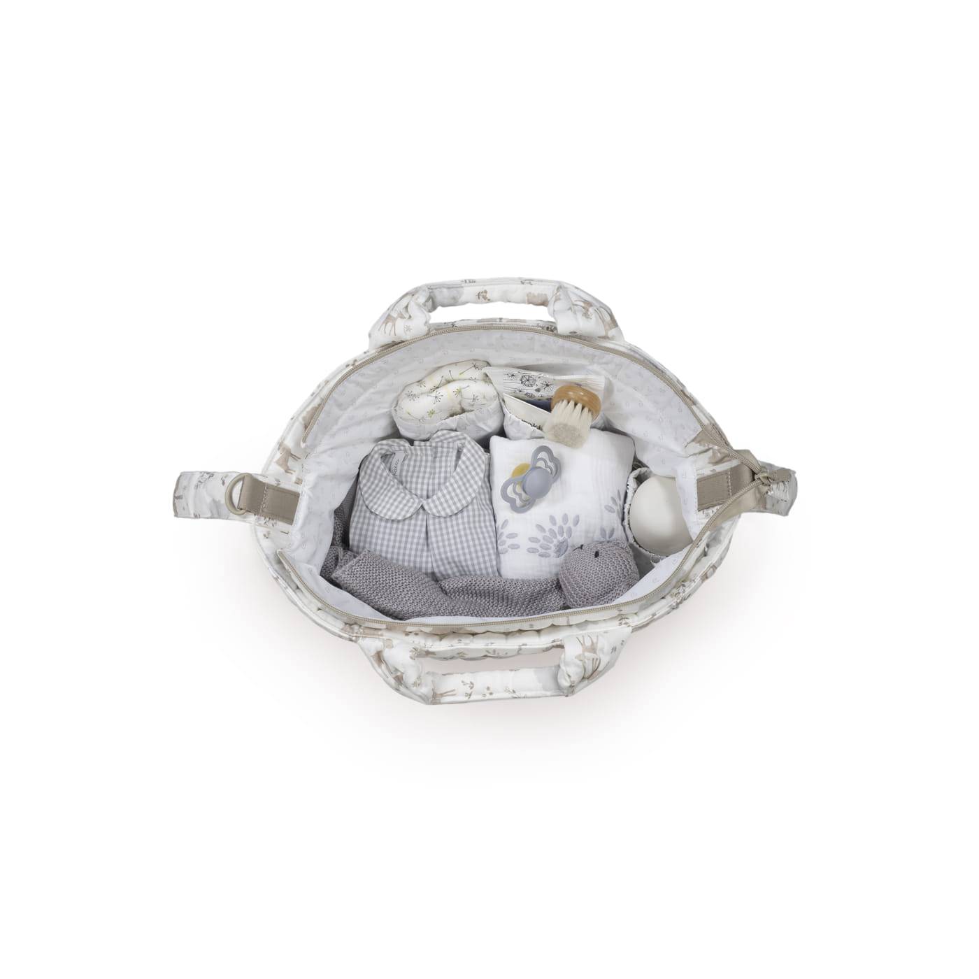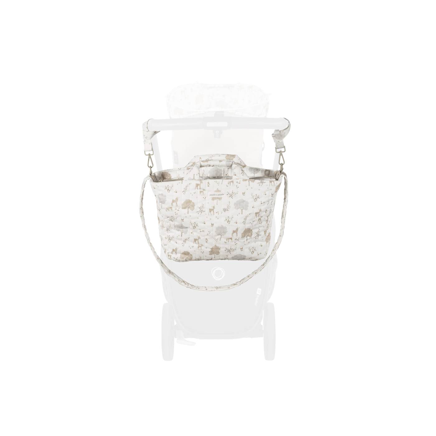 Pasito a Pasito's Nara changing bag is a unique model made of 100% cotton canvas with a delicate deer and tree print in neutral shades. The waterproof treatment makes it water-resistant, ensuring protection and durability for everyday use. It is an elegant and practical design with a large capacity that allows you to carry everything you need. It has a double handle, a long one for carrying it on the shoulder and two shorter ones for carrying it by hand, as well as additional universal straps for attaching it to the pram.