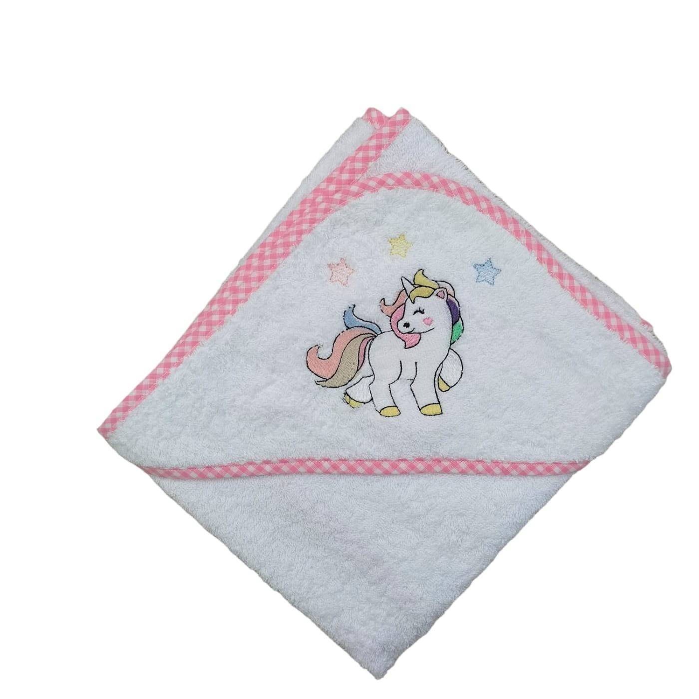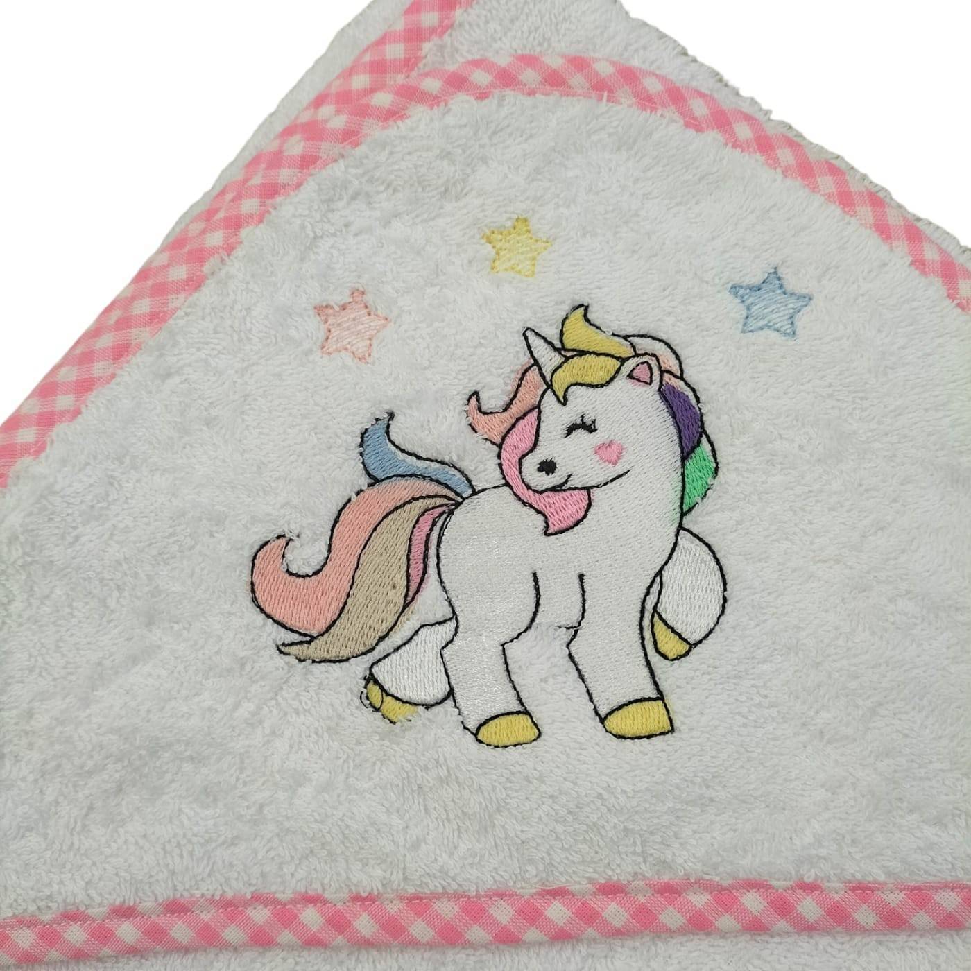Unicorn-themed bathrobe, 100% cotton terry triangle with white background, edged with white and pink checked bias.