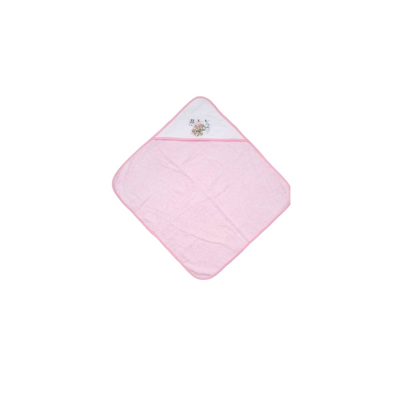 Triangle bathrobe for newborn girls made from 100% cotton terrycloth in pink, embroidered on a milk-white linen base, depicting a teddy bear embroidered in light and dark dove-grey shades; all redefined with pink bias.