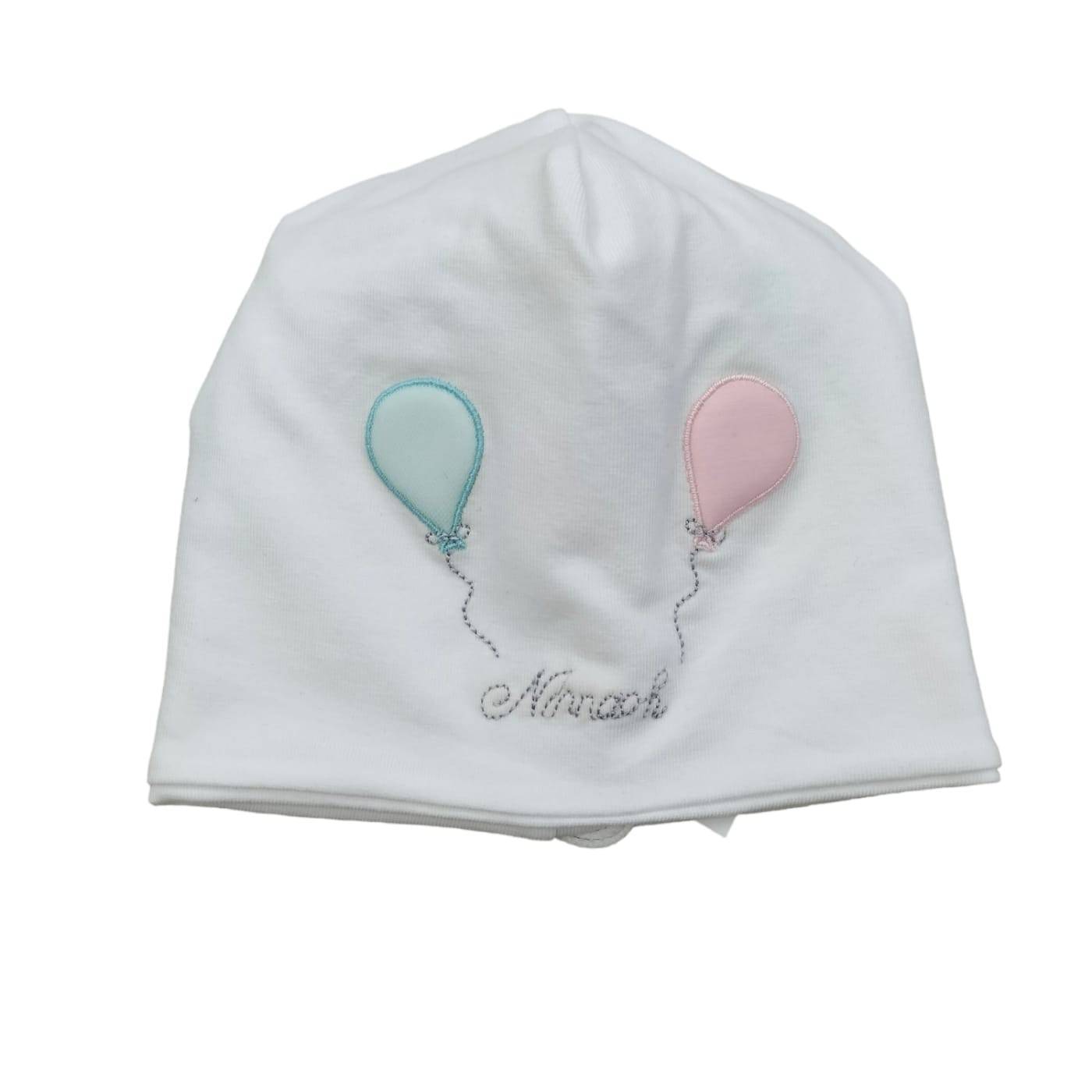 Pure, soft cotton cap from the brand Ninnaoh. White background with pink and teal balloon pattern. Useful from the baby's first days of life.