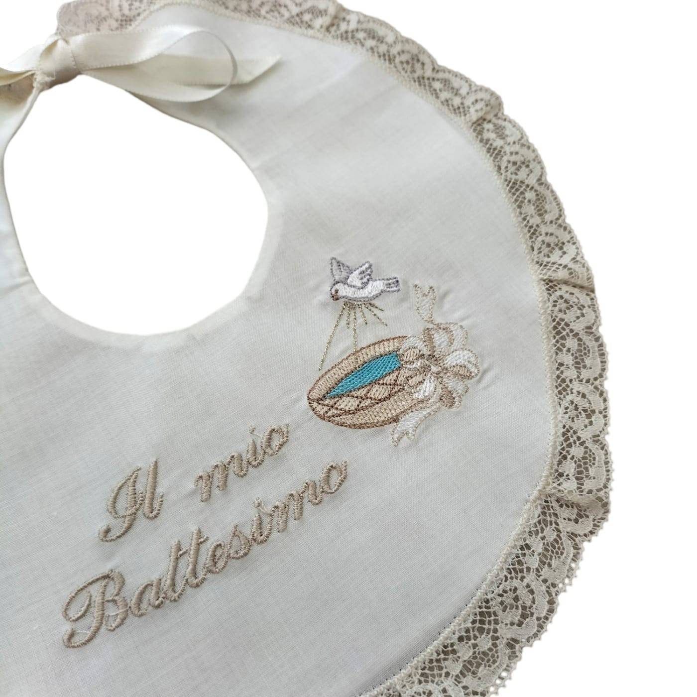 Bavette for the day of her baptism made of cream cotton muslin edged with tone-on-tone lace, embroidered baptismal font and the inscription: 'My Baptism'. Suitable for both boys and girls thanks to the neutral colours.