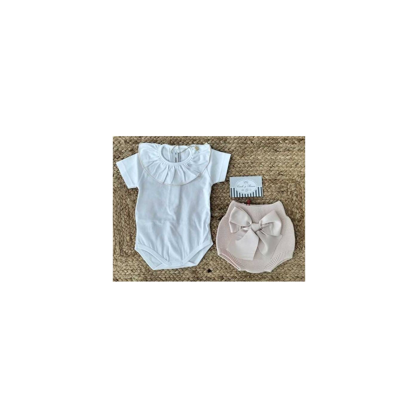 Girl's bodysuit in white cotton with nude-coloured scalloped neckline.