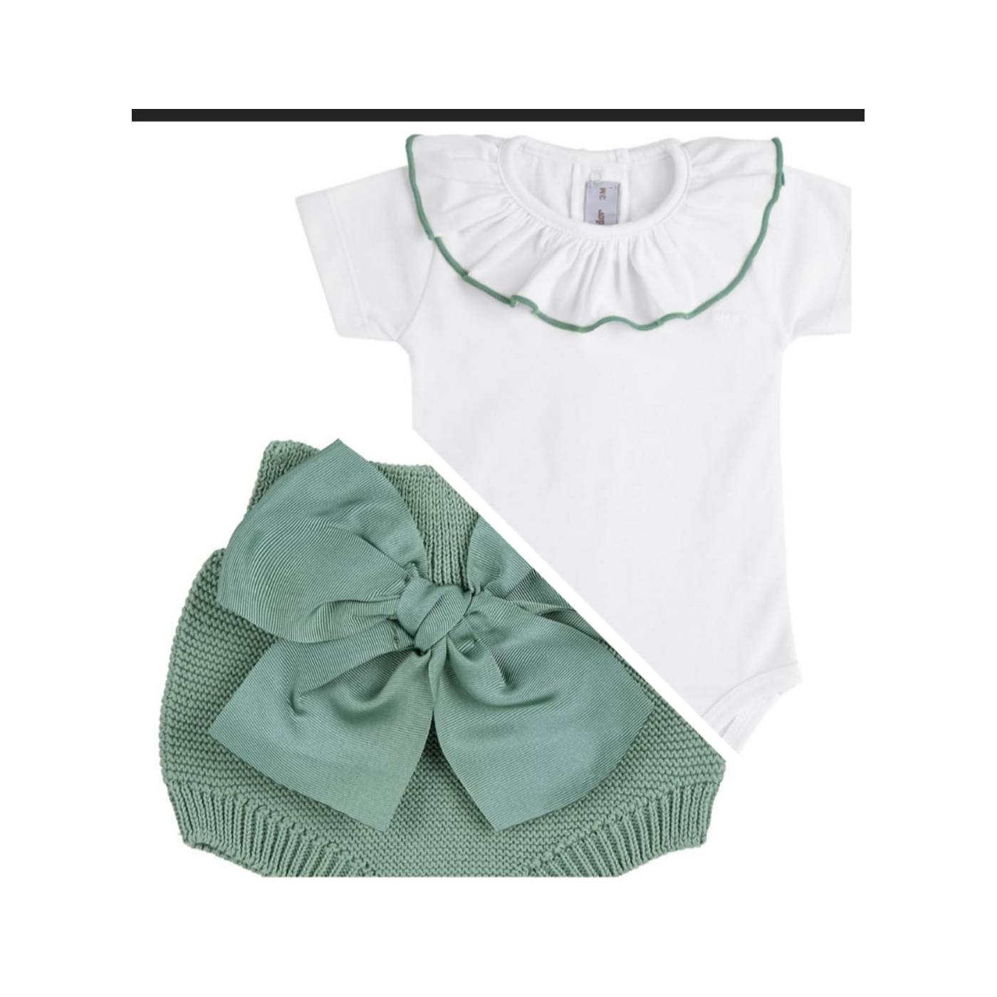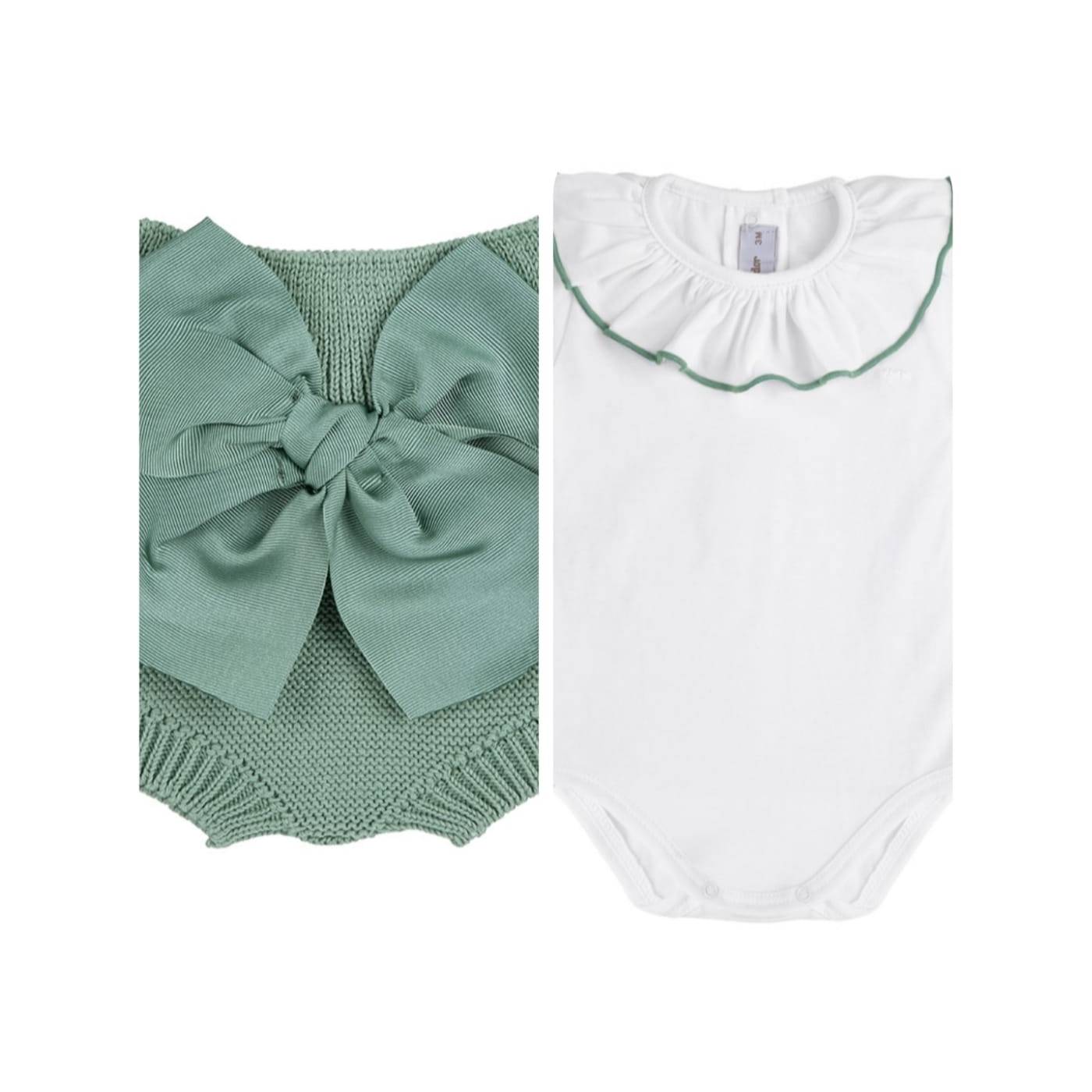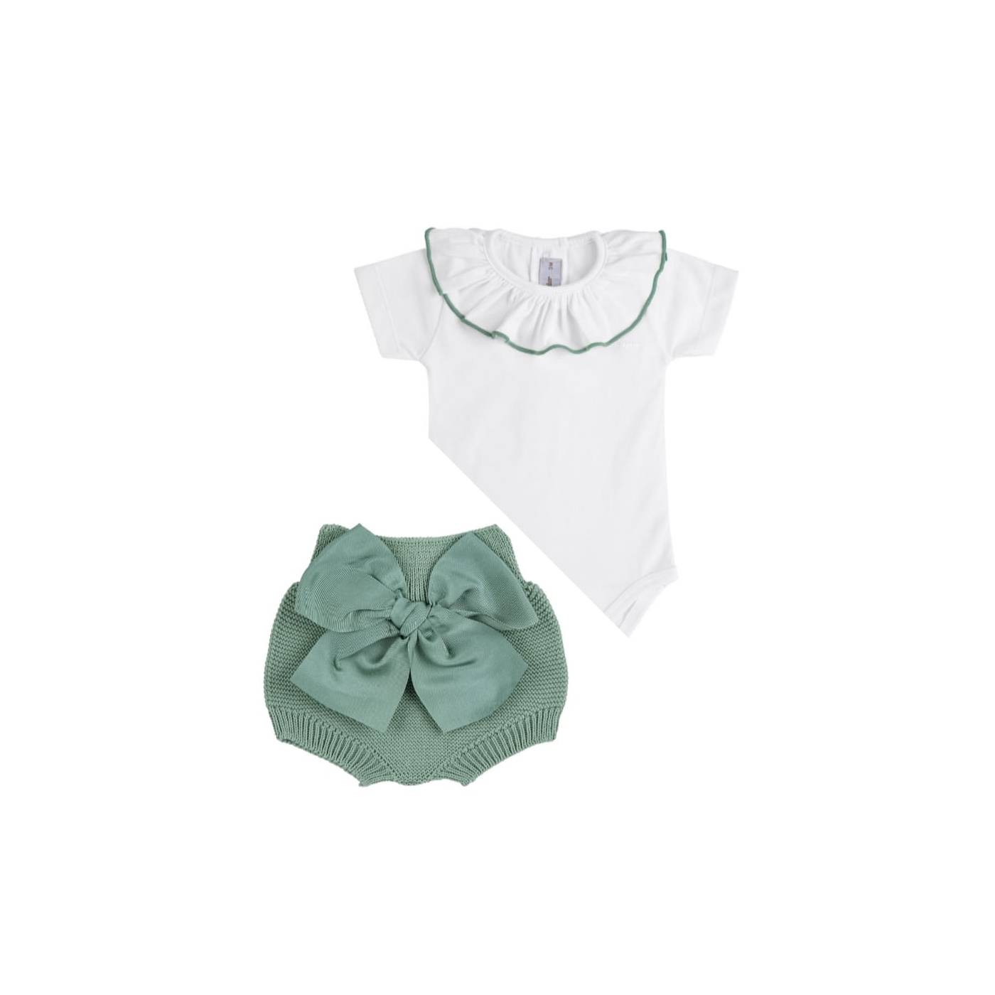 2-piece set consisting of green caravan with large bow and white half-sleeve cotton bodysuit with green thread on the collar.