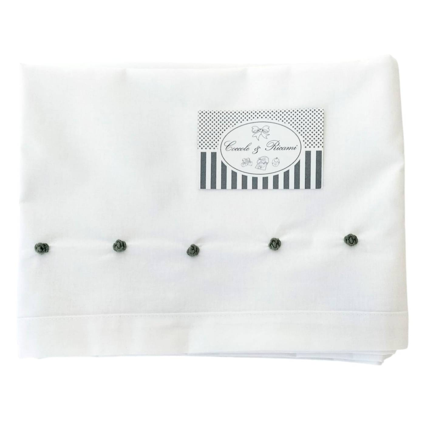 chenille cover lined in cotton measuring approximately 106*72 centimetres; white sheet with contrasting green embroidery, 100% cotton with pillowcase and underneath with corners; chenille bonnet indispensable from the baby's first hours of life; bib and 2-piece bib cover with ghettina measuring 1 month corresponds to 50/56 c