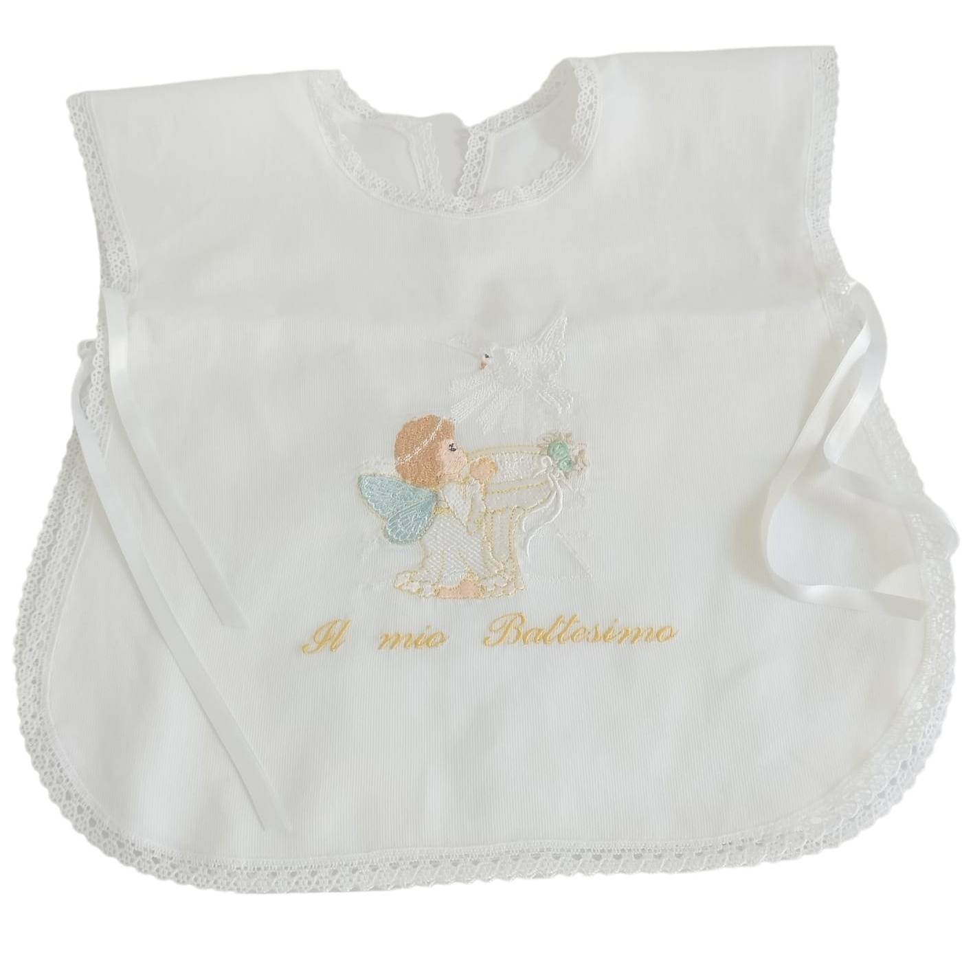 Baptismal blouse made of white striped cotton and redefined with a small tone-on-tone cotton lace, it has an embroidery in the centre depicting the symbols of baptism: angel, dove and font; phrase 'My Baptism' embroidered in gold.