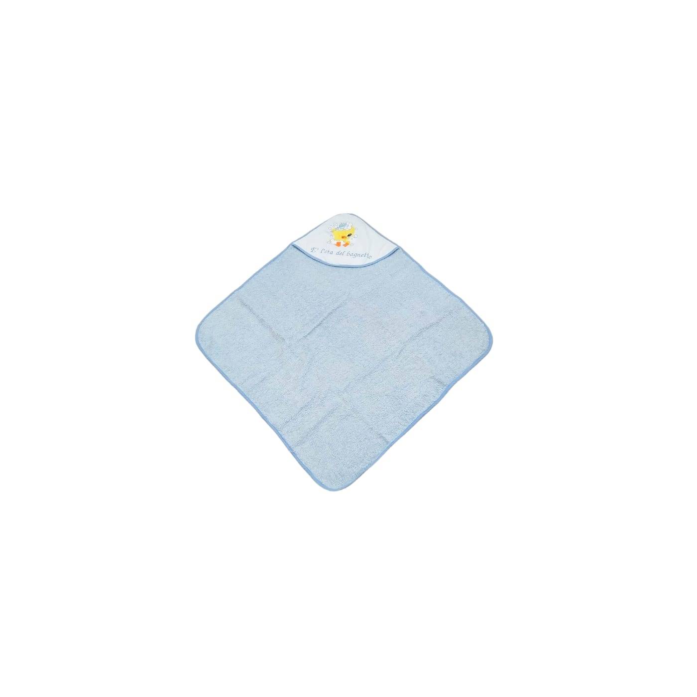 Very soft triangle bathrobe for newborns made of 100% cotton terrycloth in light blue colour, embroidery on the hood on a white cotton base with the words: "It's bath time" and a chick depicted.