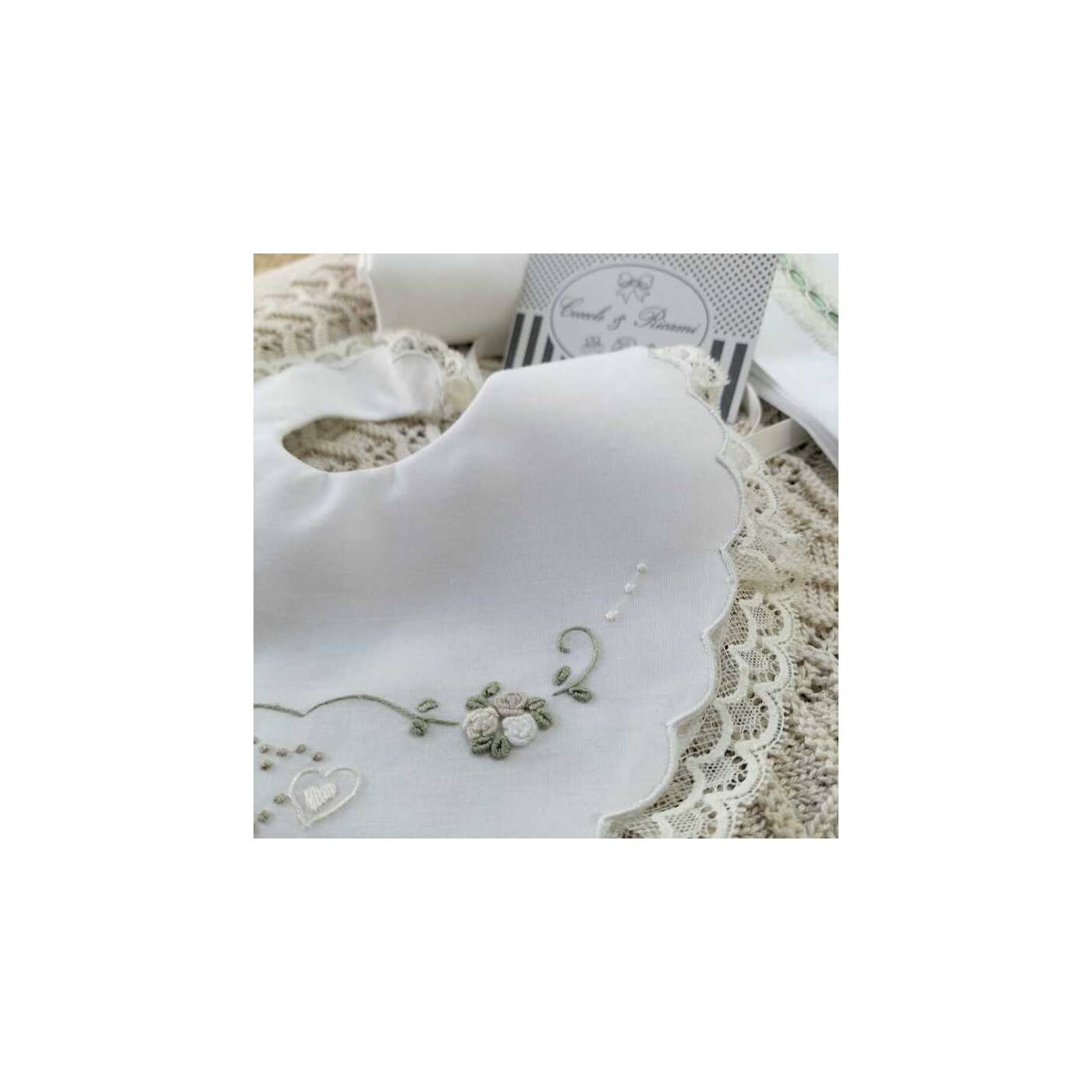 Reworked with cream-coloured lace and green satin ribbon. Matching bib.