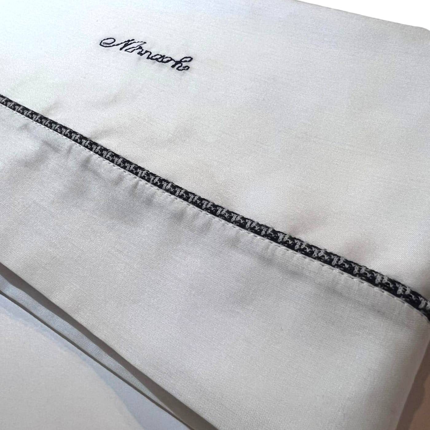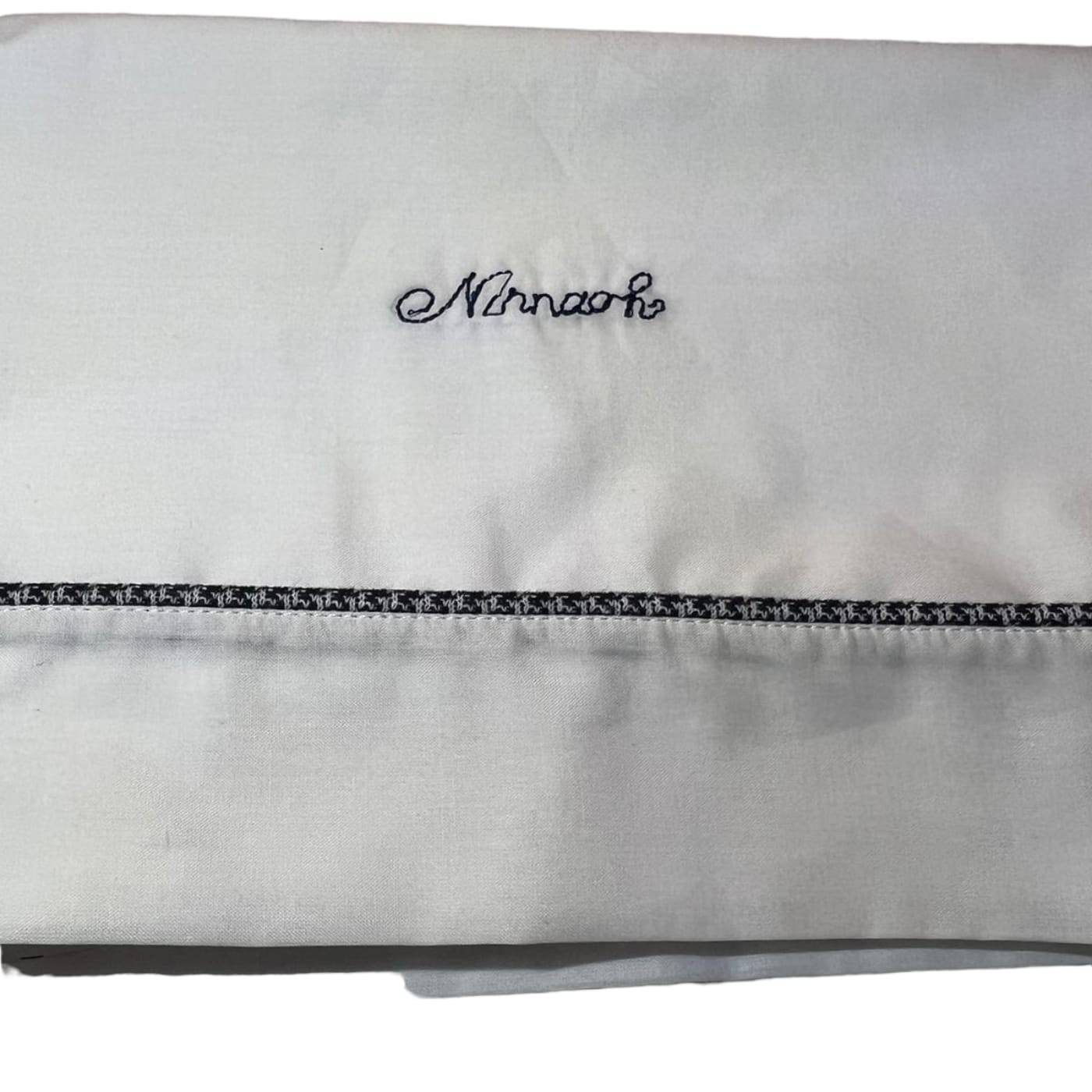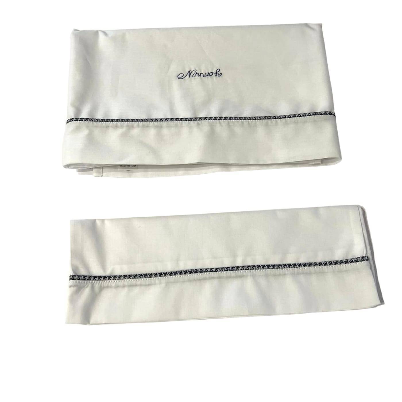 Very simple 3-piece bed sheet (with pillowcase and underneath with corners) for newborn baby in pure white cotton with "Ninnaoh" written on it in blue, easily adaptable to covers or used individually in the middle of summer. Measures 80*106 centimetres.