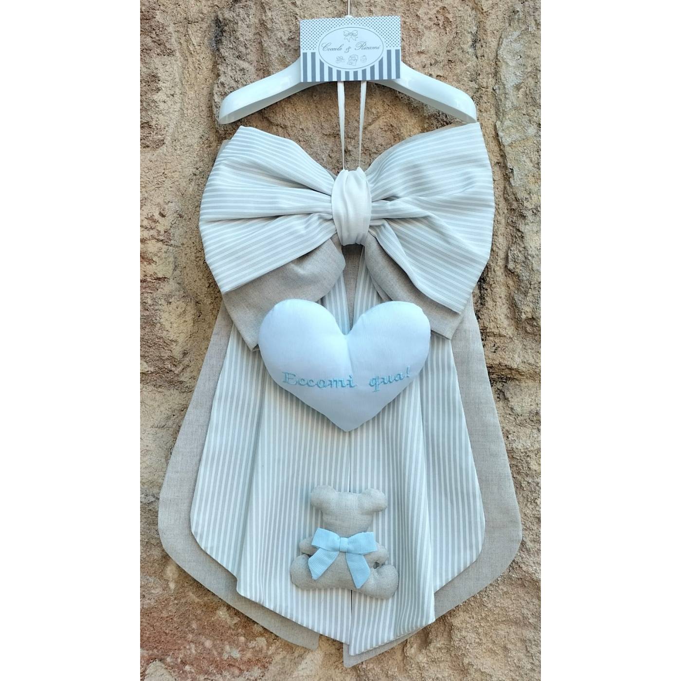 Birth bow made of linen-coloured cotton with the back and front in white and beige striped cotton, enriched by a padded heart with the phrase 'Here I am' and a small linen-coloured teddy bear with a light blue bow.