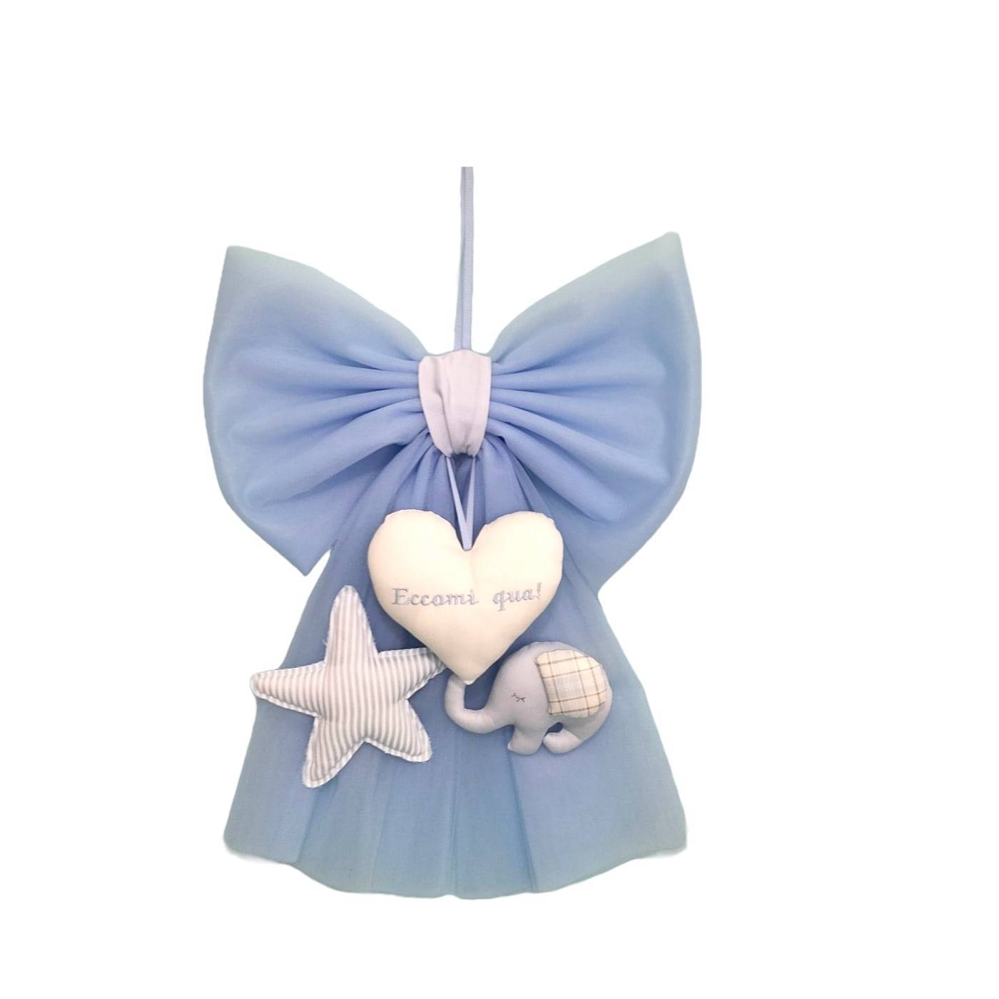 Light blue tulle newborn baby bow with cotton elephant, heart and star. Possibility to write the name. For more information call or WhatsApp us at 388 8071332.