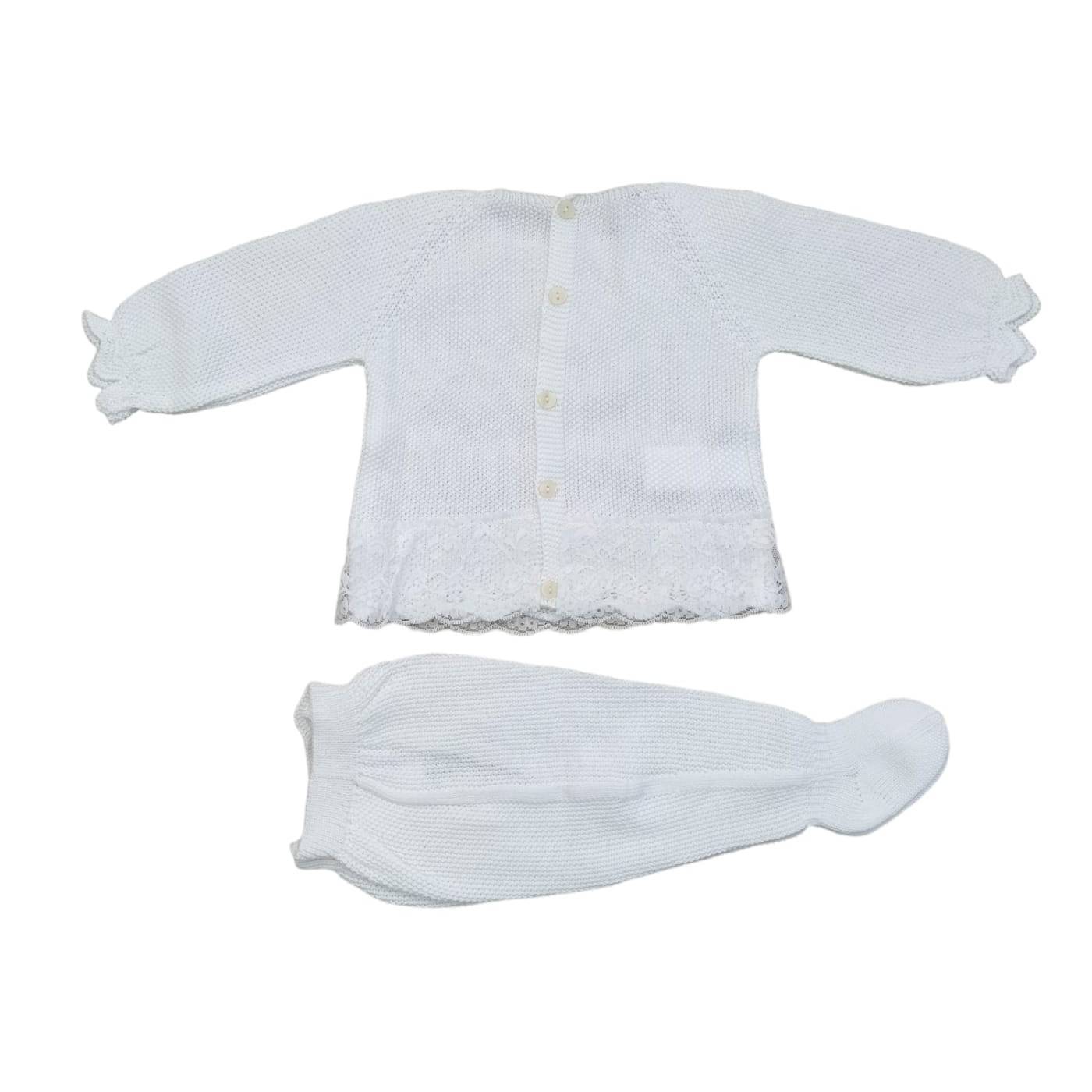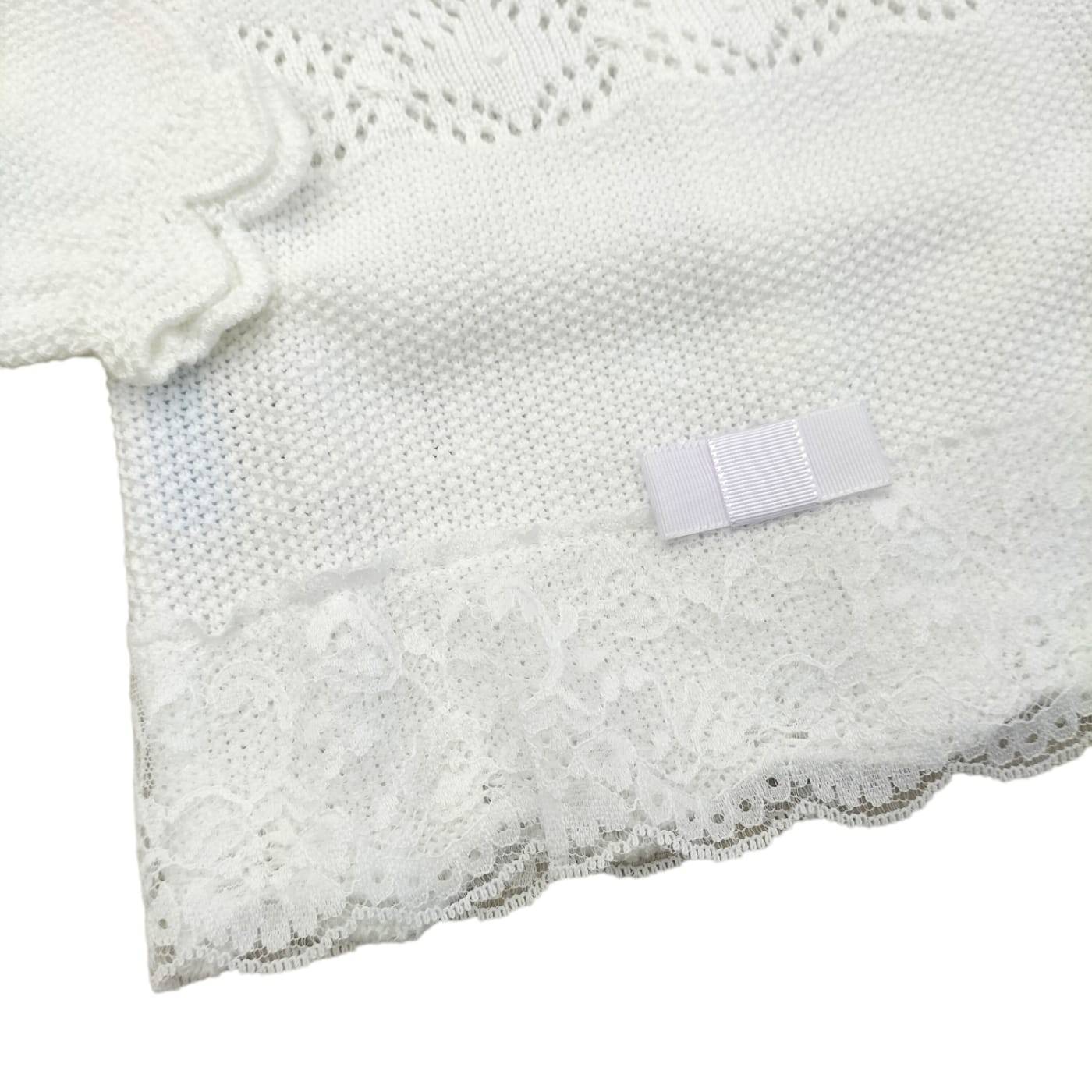 Long-sleeve cover in white cotton yarn. In the lower part of the knit there is an elegant tone-on-tone lace and in the upper part a small knit. Suitable for the baby's first days of life in high summer but also in spring and autumn.