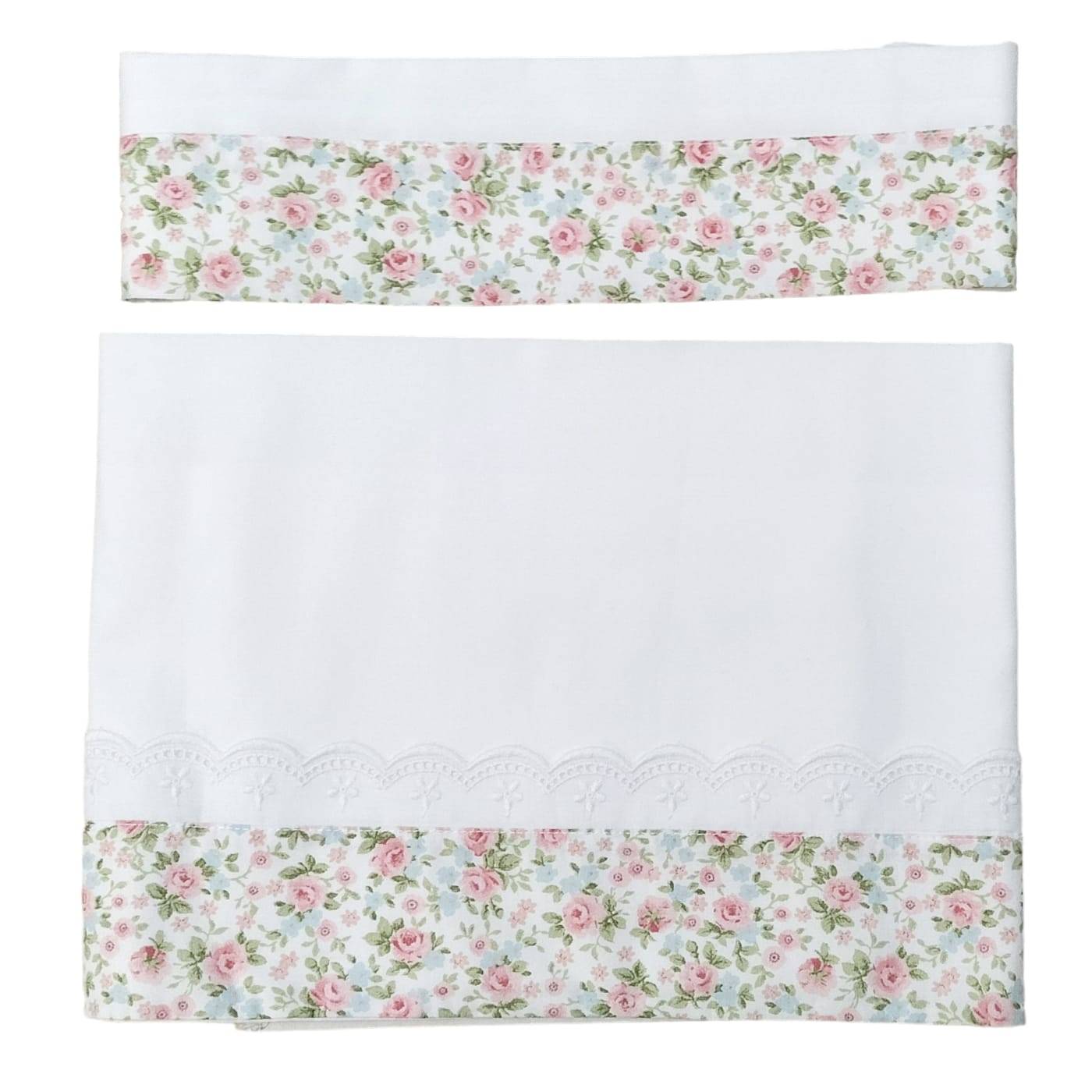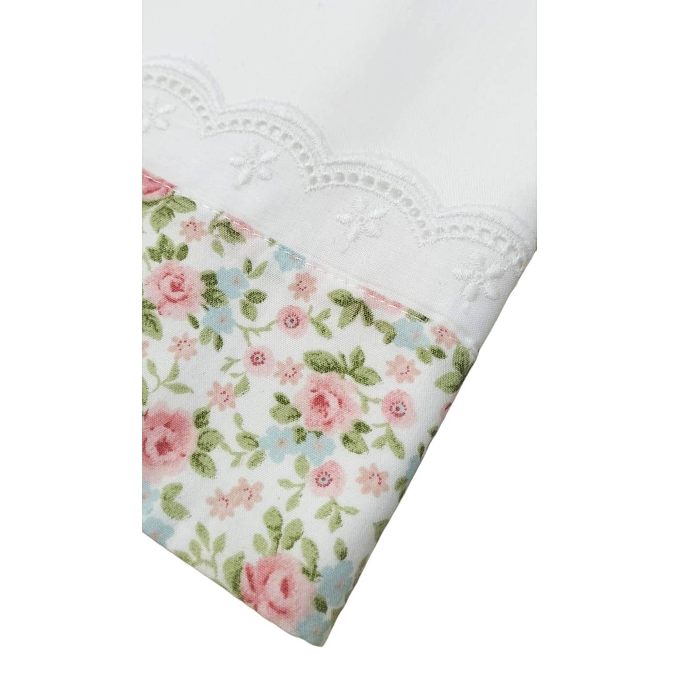 This newborn set for newborn girls is complete with everything: duvet with removable padding thanks to the aparture on the back with buttons, half of the cover is made of a linen blend and the other half of a floral fabric, in the centre a sage-green linen fabric band and a fine St. Gallen lace that gives the garment a special touch, the latter is found as a detail on everything else; a 2-piece coverlet consisting of a dress with doll-effect skirt and ghettina, size 1 corresponding to 50/56 centimetres; a 3-piece sheet with pillowcase and underneath with corners, white background with floral flounce and San Gallo lace; finally, a bib and bonnet, the latter indispensable from the baby's first hours of life.