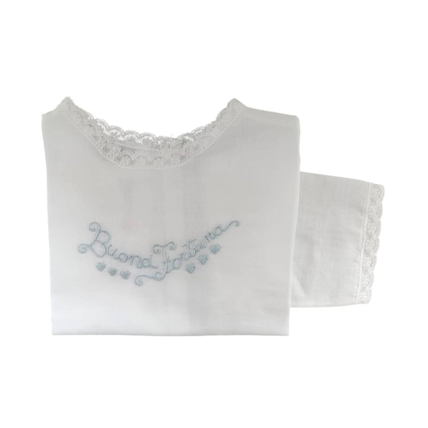 Made on a 100% pure cotton base in white and hand-embroidered in light blue with the inscription: 'Good Luck'.