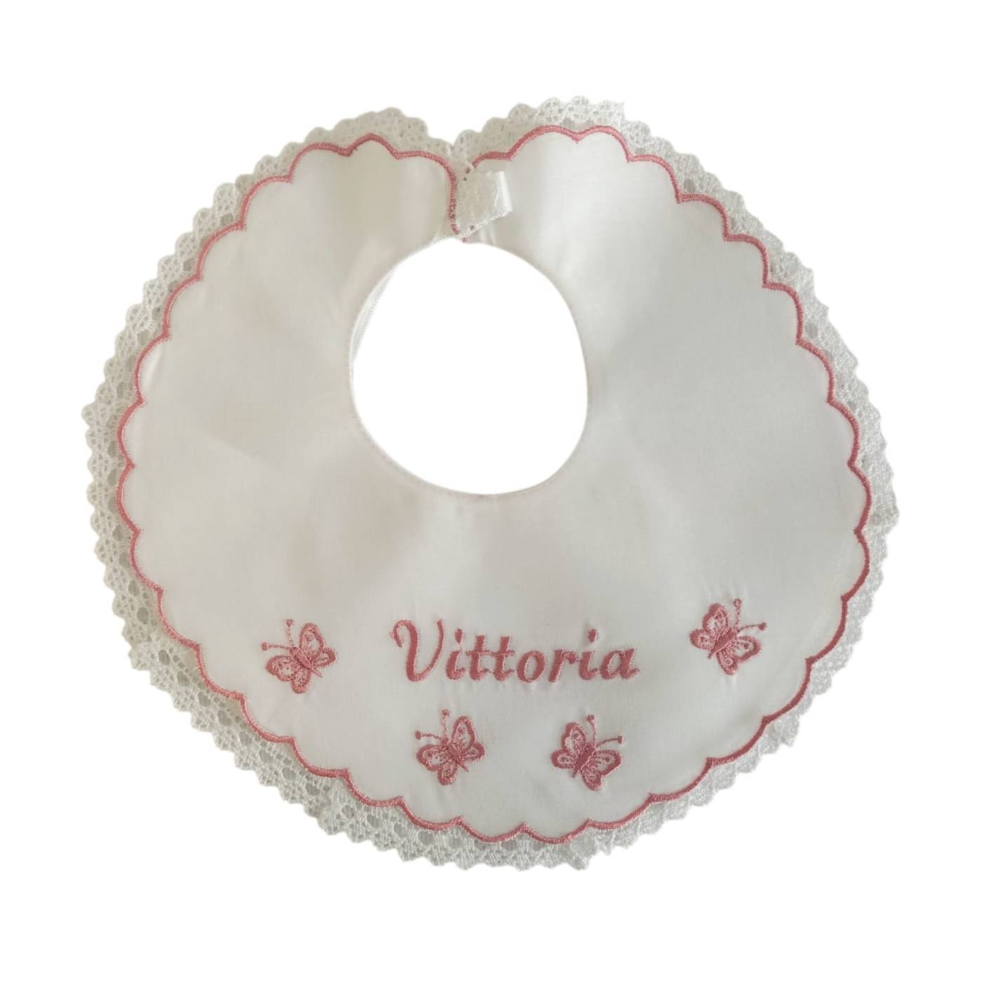 Bib made of white cotton muslin, redefined with tone-on-tone cotton emery and lace, cyclamen pink embroidery.
