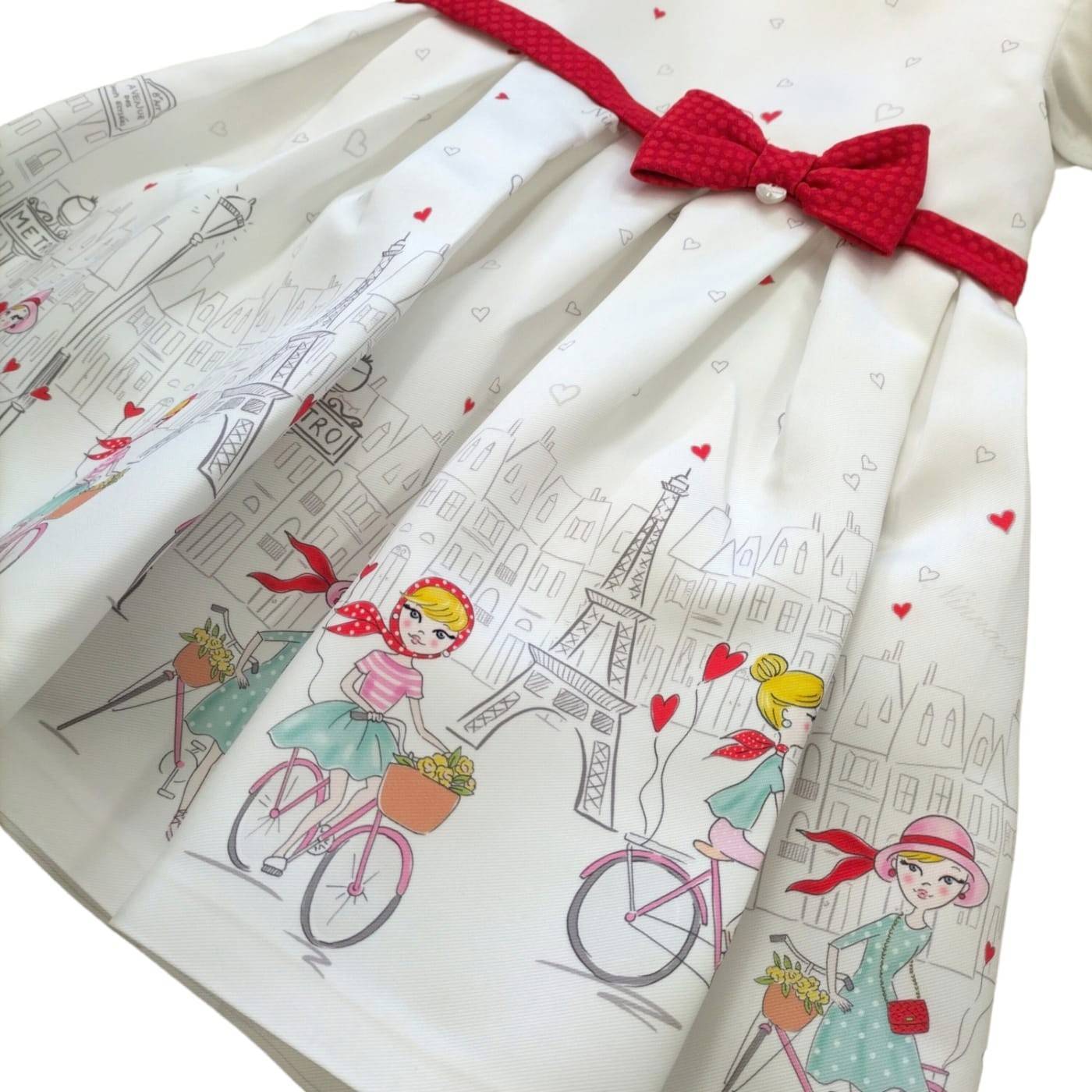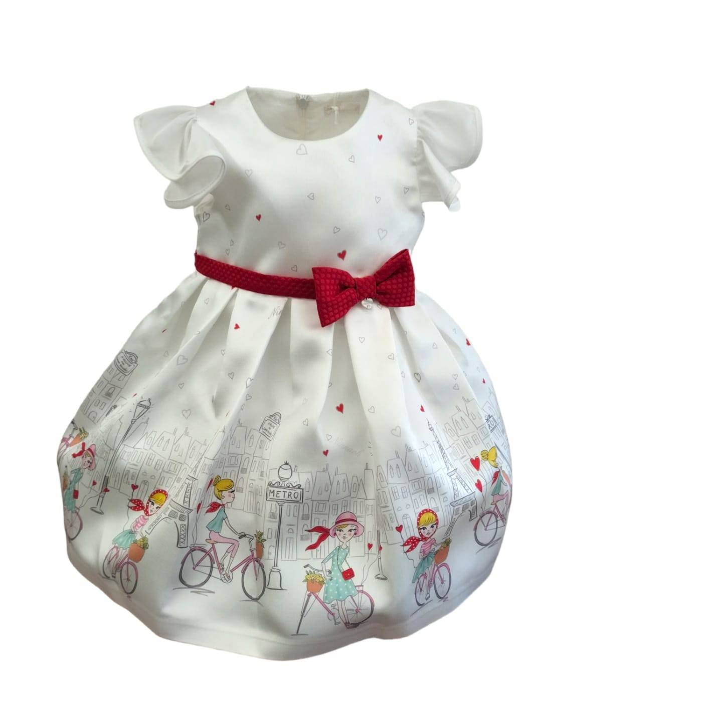 Abito Ninnaoh smanicato con volantini, effetto raso di seta fondo bianco con finto cintino e fiocco rosso in vita, fantasia sulla gonna. Questo abito è un idea da indossare per il suo primo compleanno.