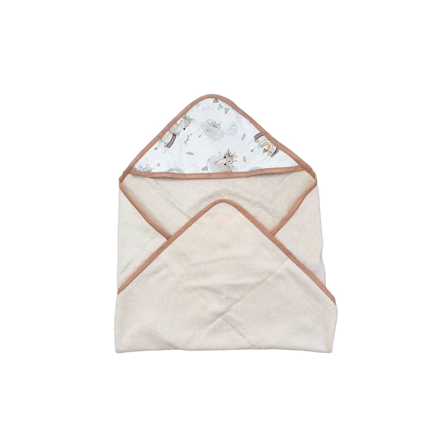 Accapatoio neonato triangolo in spugna 100% cotone color avorio bordato con sbiego in contrasto tortora scuro e cappuccio con cotone a fantasia con nuvole, arcobaleni e cerviatto. Neutro adatto sia per neonata che per neonato.