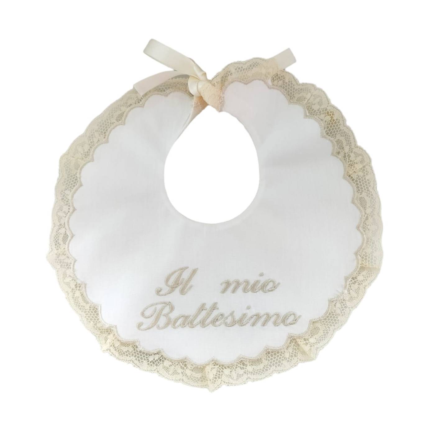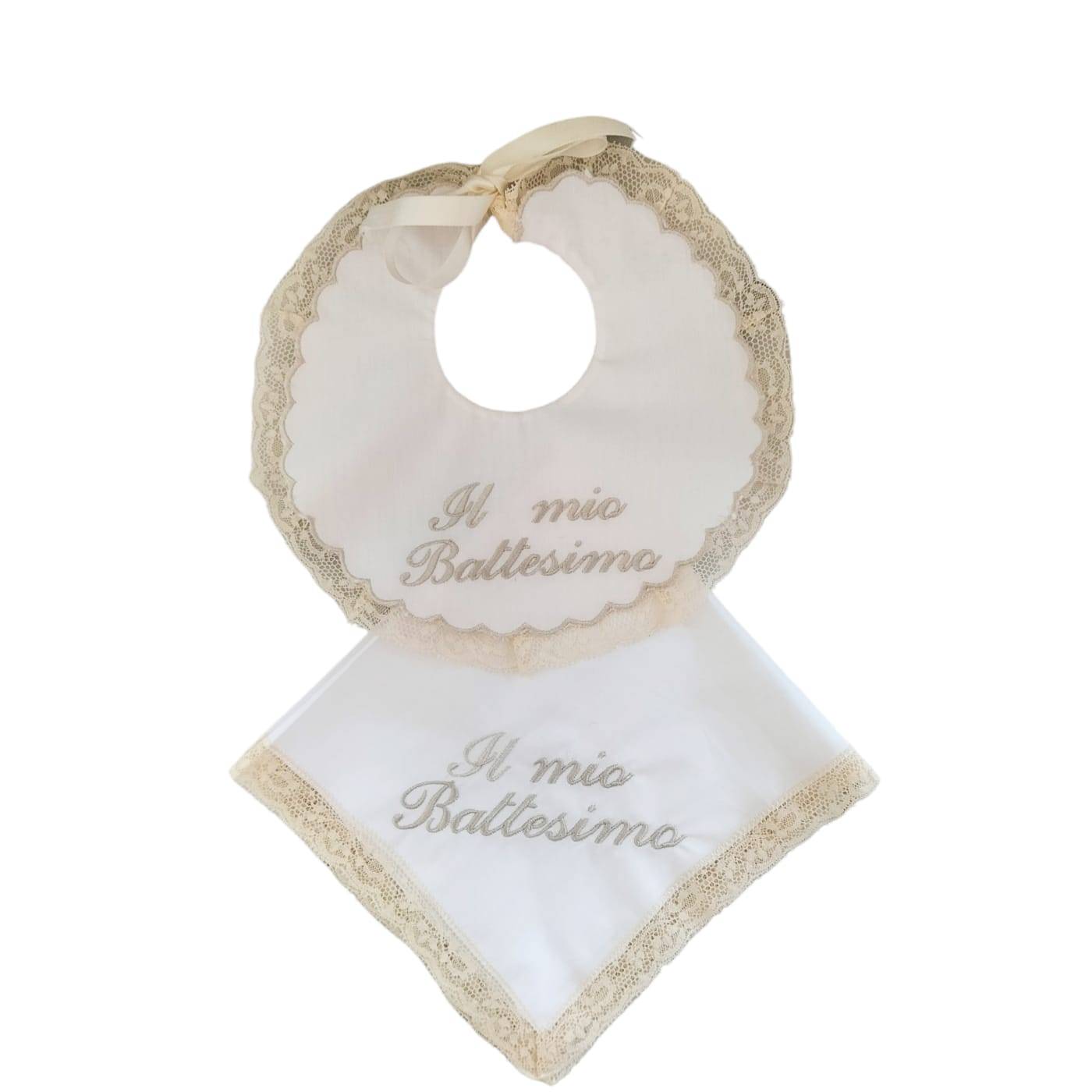 Per il giorno del suo Battesimo non possono mancare accessori come la bavetta ed il fazzolettino per completare il suo outfit già elegante. Realizzati in morbido cotone color panna presentano la frase ricamata " Il mio Battesimo". Entambi sono ridefiniti con pizzo francese valenciennes tono su tono.