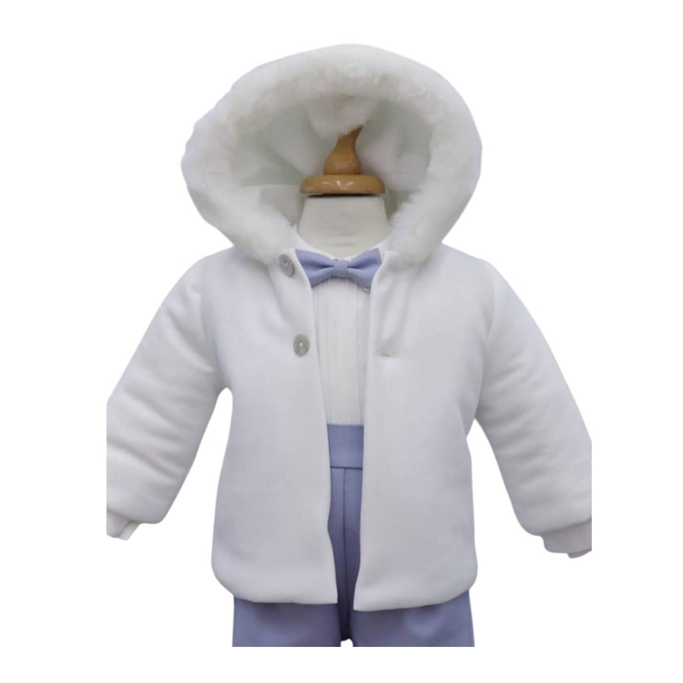 Giubbotto color bianco latte con cappuccio bordato in ecopelliccia tono su tono, chiusura con 2 bottoni.