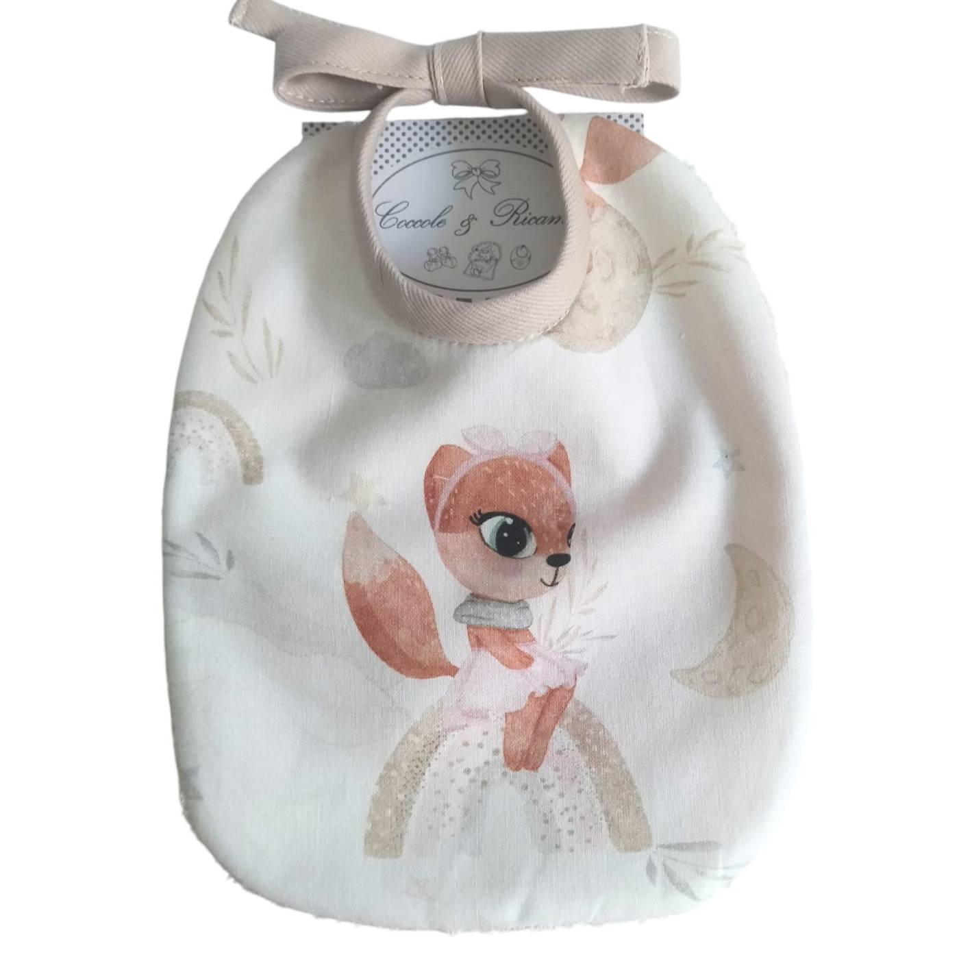 Bavetta neonata double face, cotone stampato volpina e spugna.
