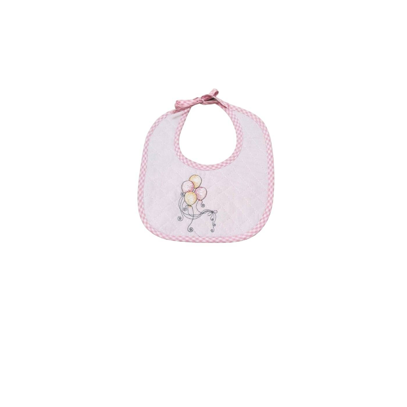 Simpatica bavetta realizzata in morbida trapuntina di cotone rosa con palloncini ricamati a macchina, ridefinita con sbiego ed attaccatura con lacci.