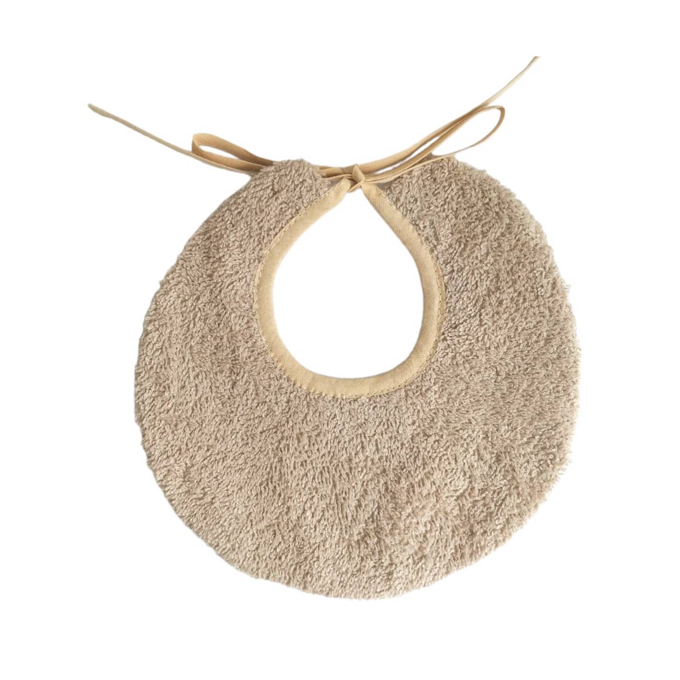 Bavaglino per neonato/a realizato in cotone stampato e spugna color tortora sul retro.