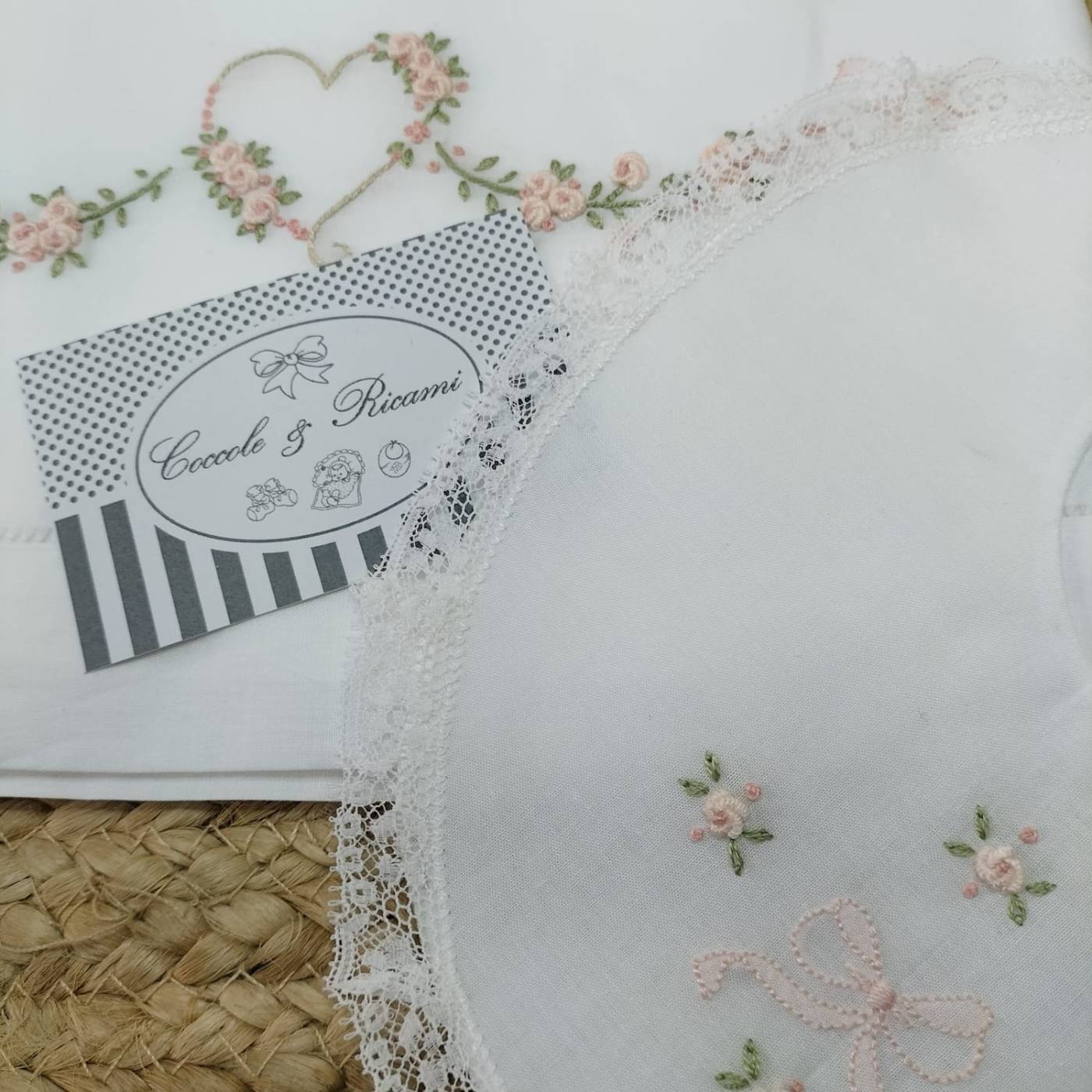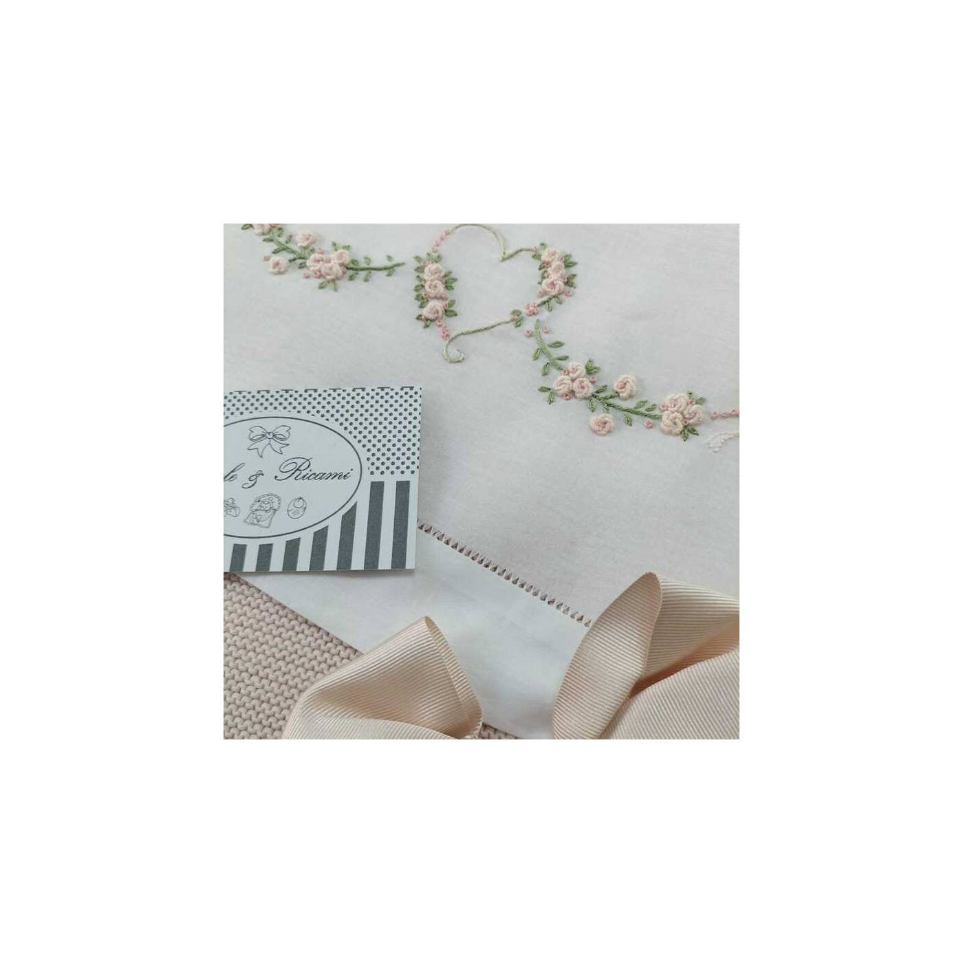 Lenzuolino per neonata realizzato in morbidissima mussola di cotone con ricamo interamente a mano, cuore centrale, fiocchetti laterali e roselline a vapore rendono questo lenzuolino romantico e delizioso.