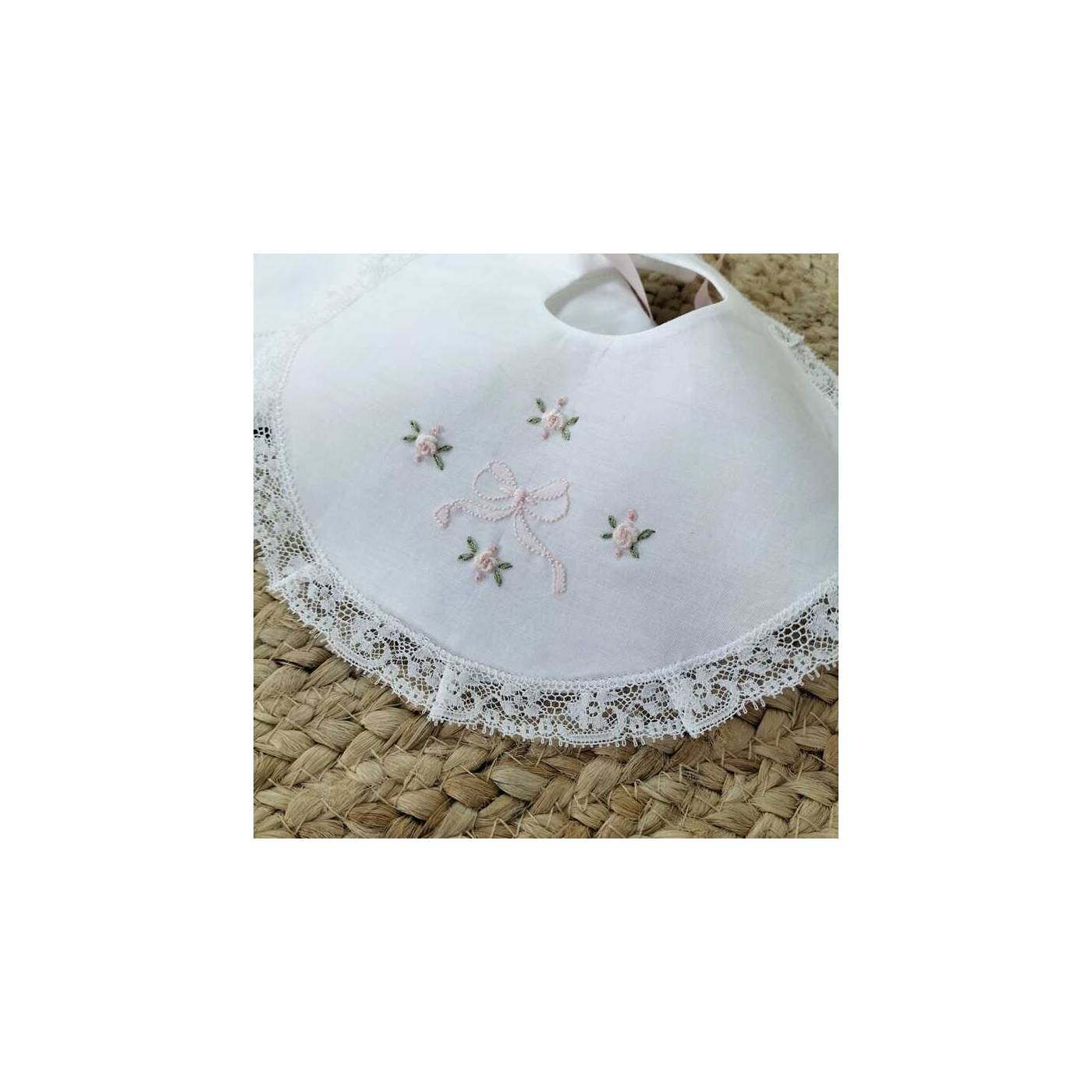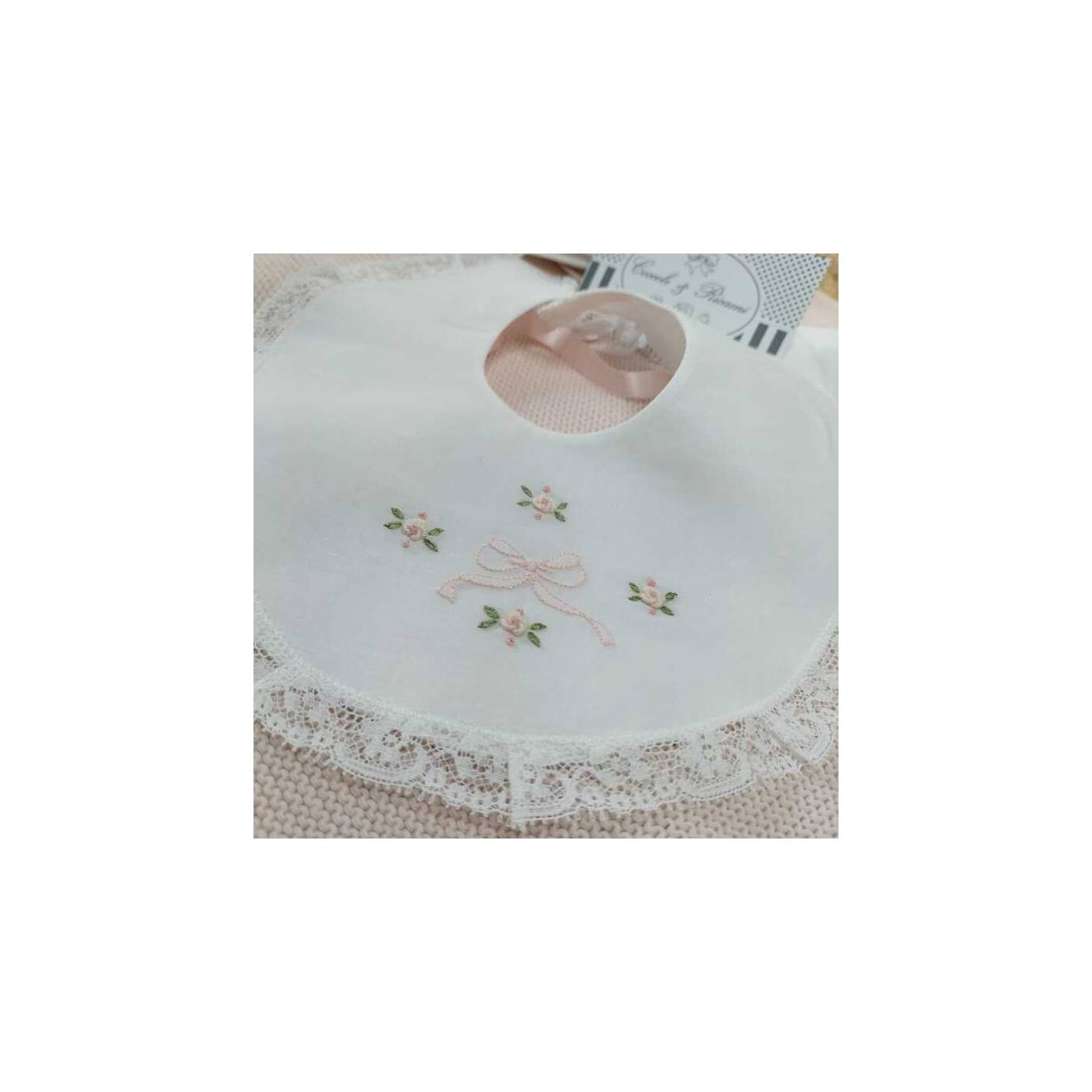 Il lenzuolino è ridefinito con punto a giorno, in coordinato la sua bavetta.