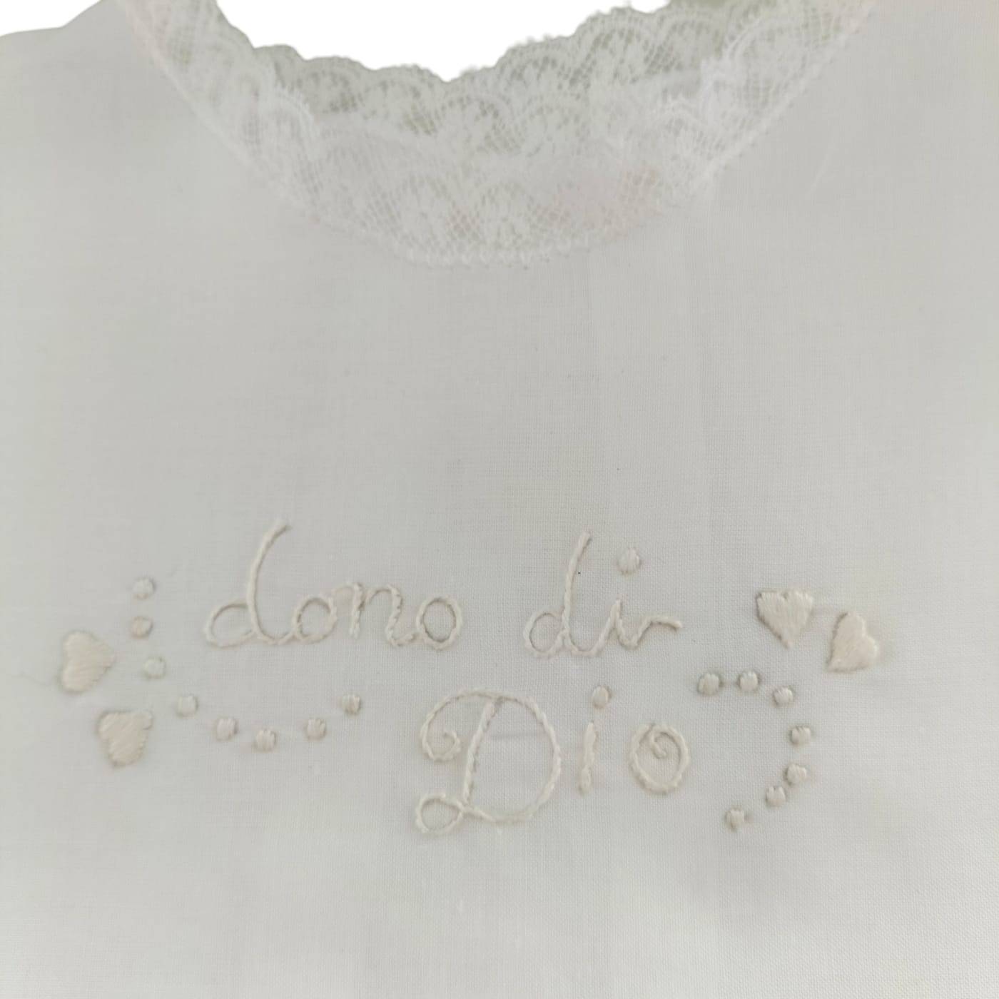 Realizzata su una base di puro cotone 100% color bianco e ricamata a mano tono su tono con la scritta: "Dono di Dio".
