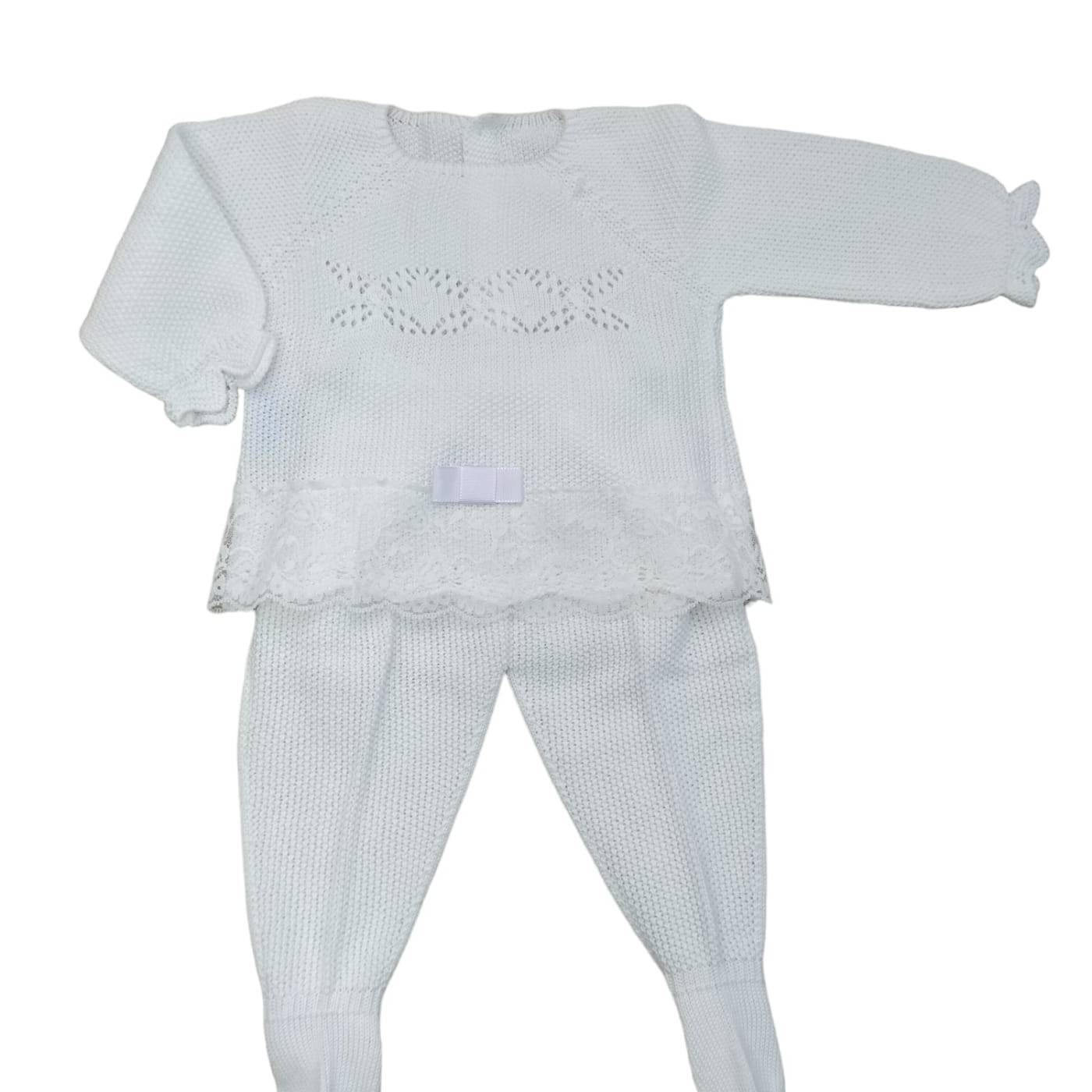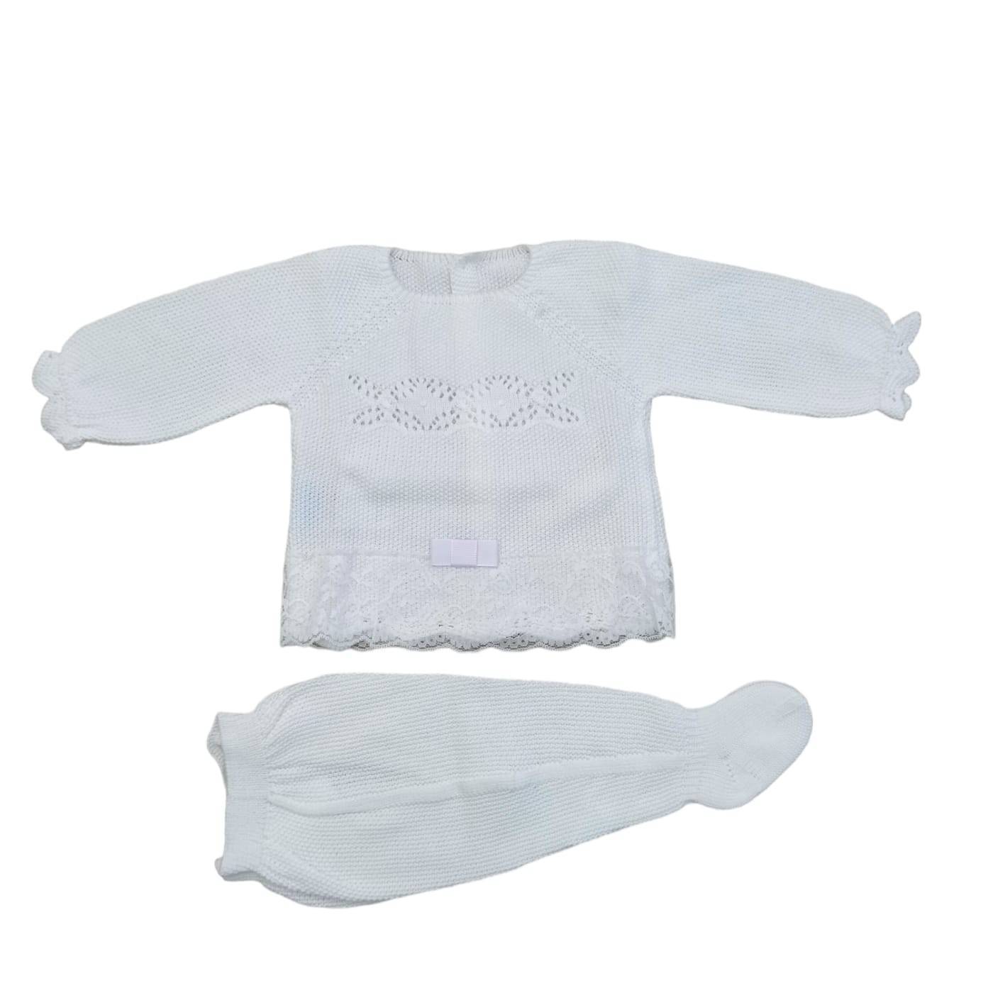 Coprifasce manica lunga in filo di cotone bianco. Nella parte inferiore della maglia è presente un elegante merletto tono su tono mentre nella parte superiore una piccola lavorazione a maglia. Adatto per i primi giorni di vita della bambina che nasce in piena estate ma anche nel periodo primaverile ed autunnale.