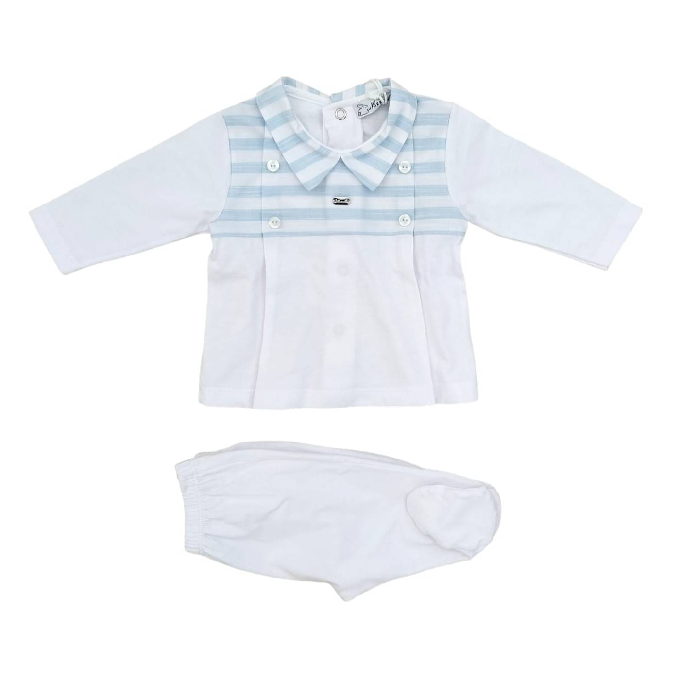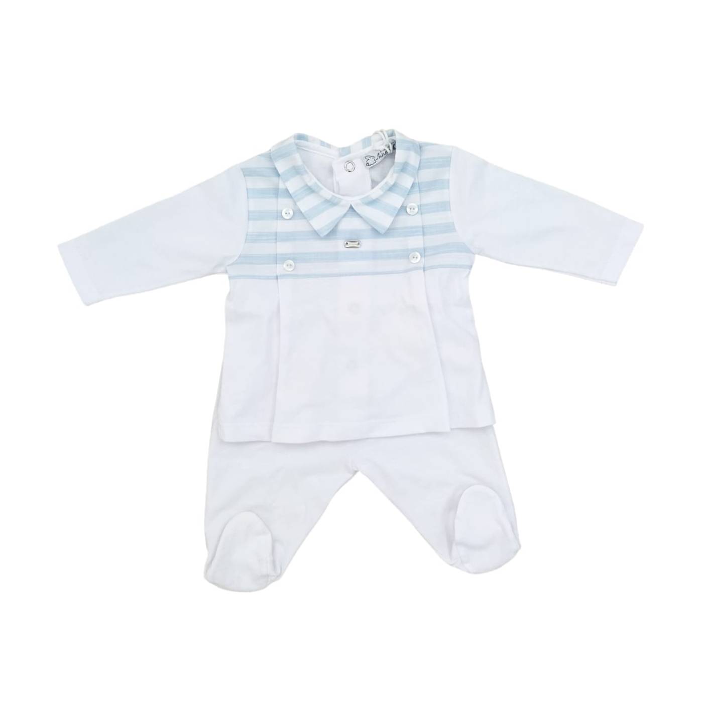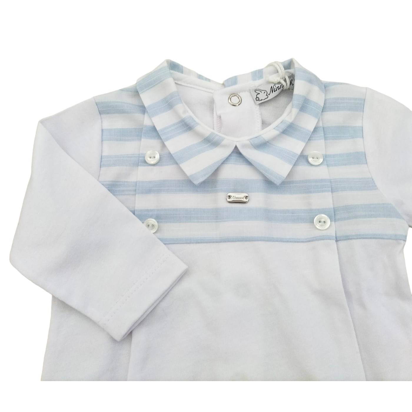 Coprifasce in jersey di cotone a manica lunga con ghettina del brand Ninnaoh misura 1 mese corrispondente a 50/56 centimetri, fondo bianco corpetto a righe celesti.