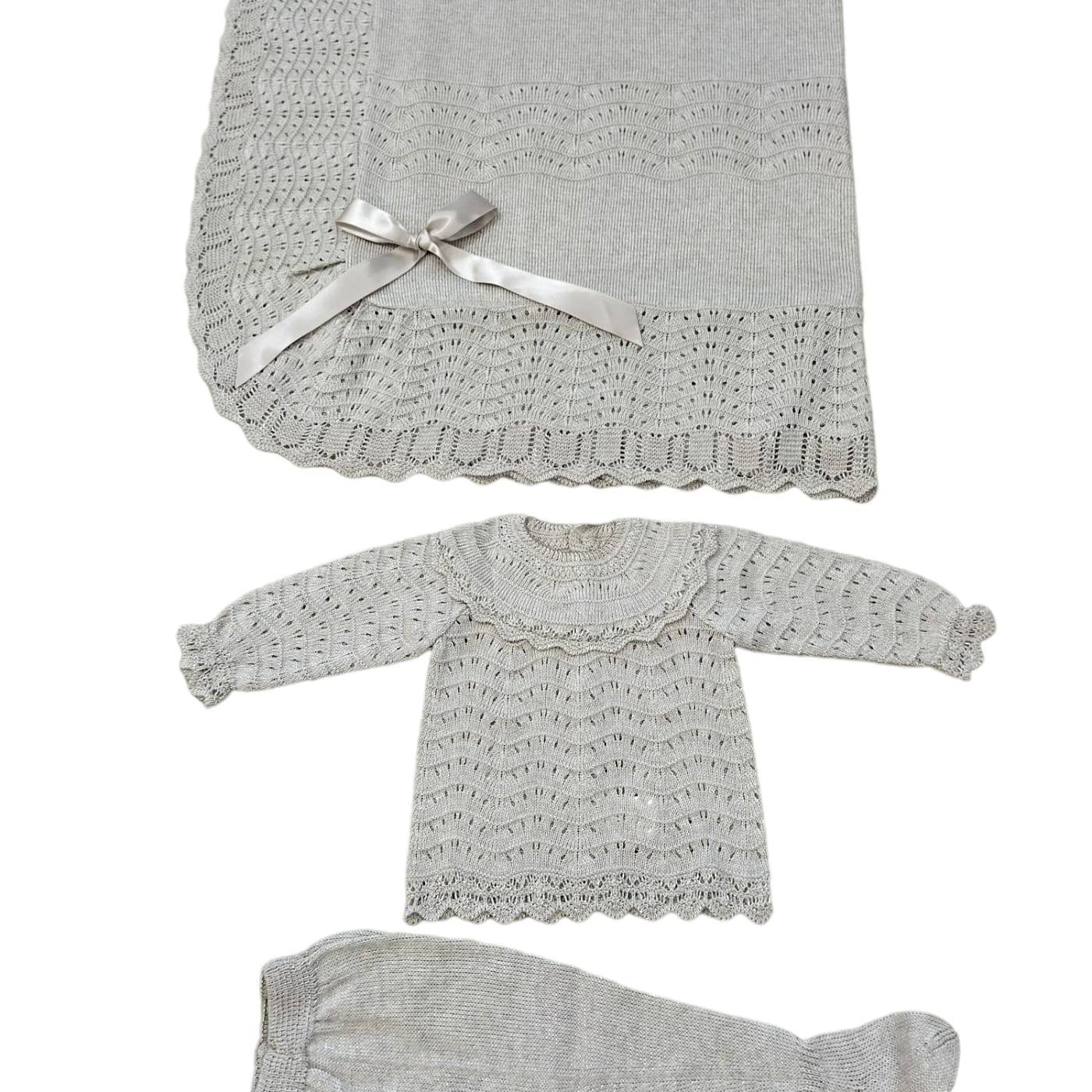 Copertina e coprifasce a manica lunga in coordinato color tortora chiaro in filo di cotone, quindi adatto sia per la femminuccia che per il maschietto. Adatto per il bambino che nasce in piena estate ma anche in primavera ed inizi autunno.