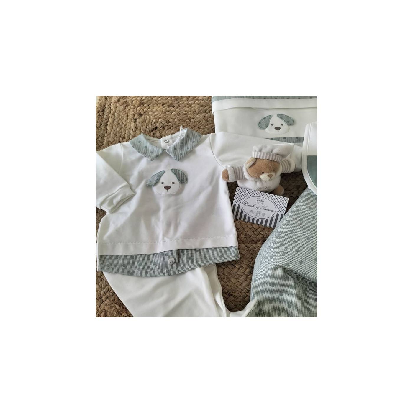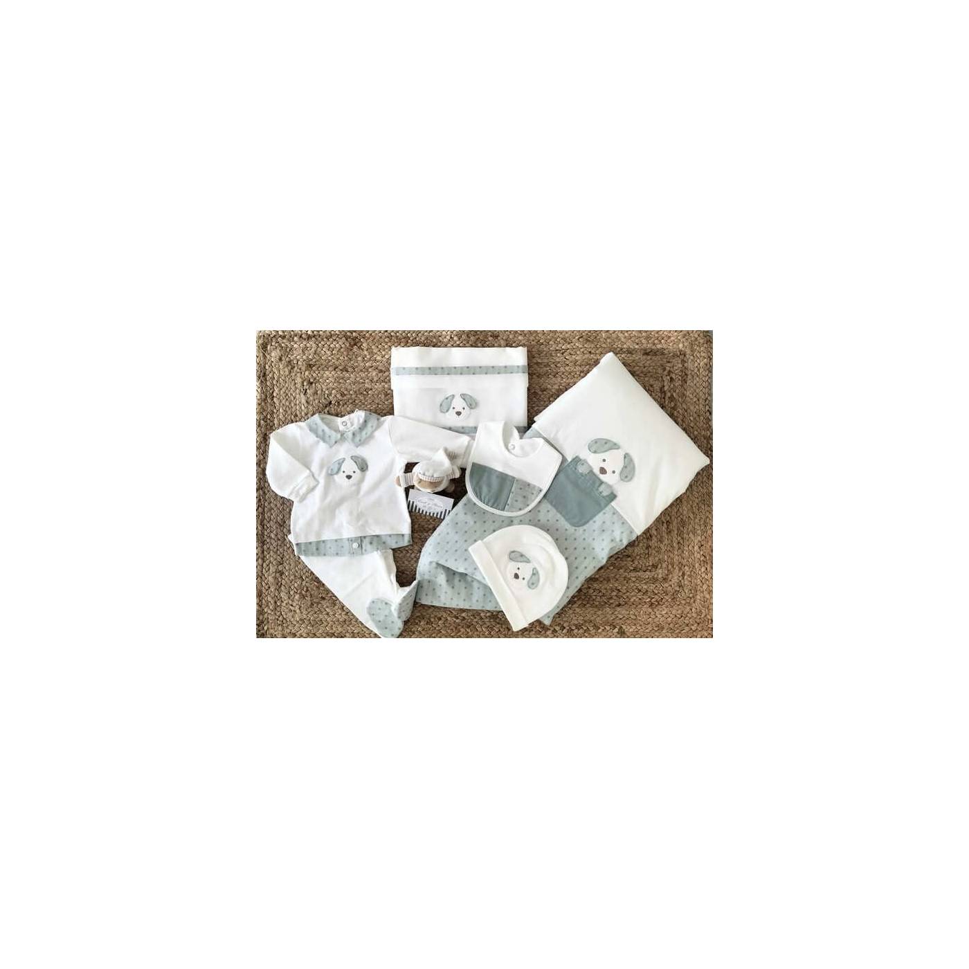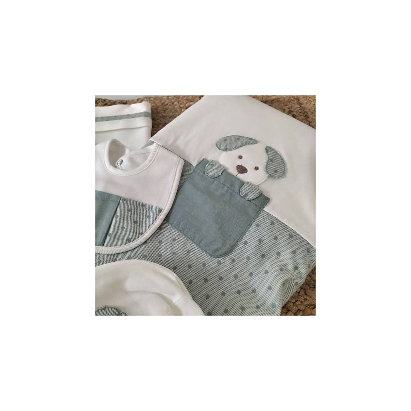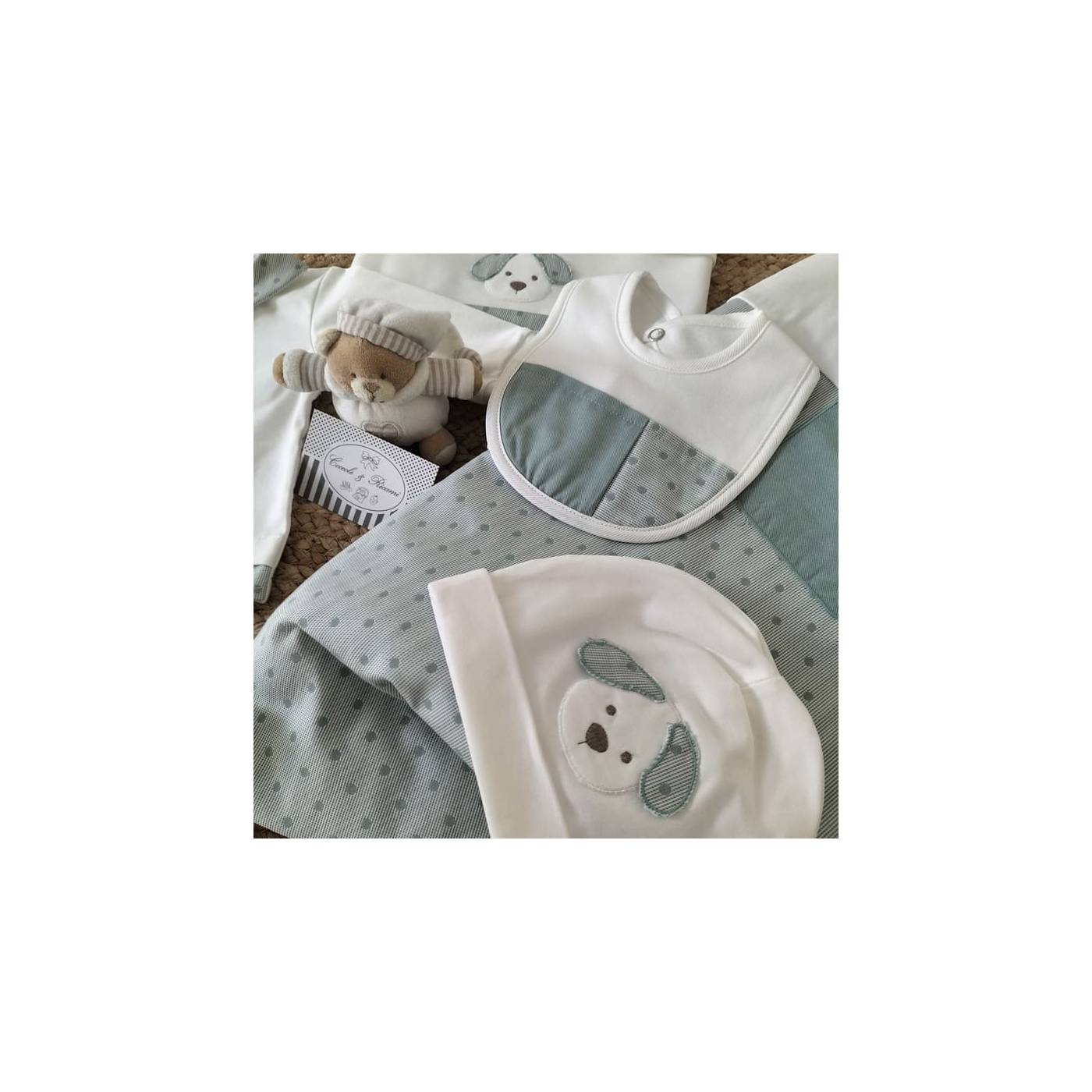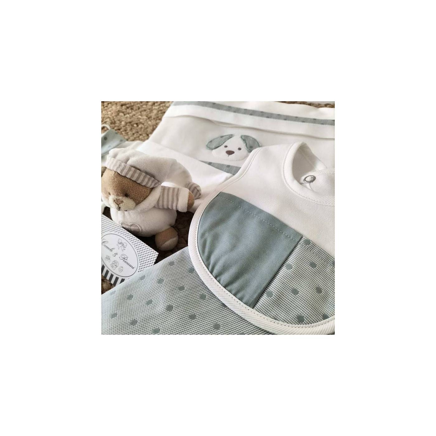 Set nascita in cotone del brand Teto&Tatta completo di tutto. Copertina con piumino estraibile grazie all'apertura sul retro, fondo bianco con al centro orsetto in applique verde salvia; lenzuolino 3 pezzi con federa e sotto con angoli in mussolina  di cotone;  bavetta; cuffietta; coprifasce a manica lunga 2 pezzi misura 1 mese corrispondente a 56 centimetri.