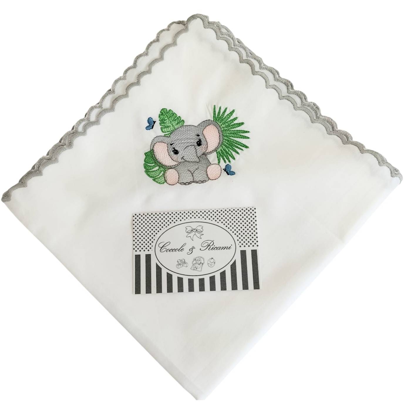 Quadrato in batista di cotone bianco bordato con smerlino grigio e ricamato un simpatico elefantino safari su un angolo. Essendo di cotone biologico risultano estremamente morbido sulla pelle delicata del bambino, traspirante ed assorbente. Utile fin dalle prime ore di vita del bambino e dai molteplici usi: per l'allattamento; come lenzuolino estivo; per asciugare il visino, le manine... del bambino dopo il bagnetto; in estate per le sedute dei seggiolini auto e dei passeggino;, per appoggiarlo sulla spalla della mamma al momento del ruttino...