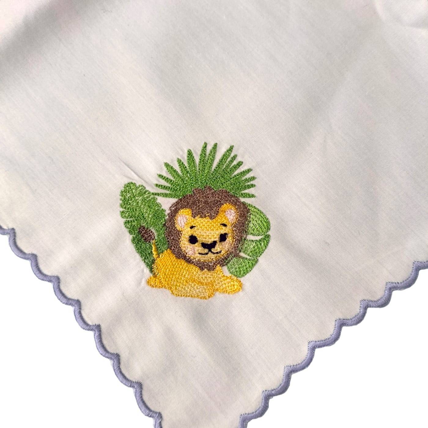Quadrato in batista di cotone bianco bordato con smerlino celeste e ricamato un simpatico leoncino safari su un angolo. Essendo di cotone biologico risultano estremamente morbido sulla pelle delicata del bambino, traspirante ed assorbente. Utile fin dalle prime ore di vita del bambino e dai molteplici usi: per l'allattamento; come lenzuolino estivo; per asciugare il visino, le manine... del bambino dopo il bagnetto; in estate per le sedute dei seggiolini auto e dei passeggino;, per appoggiarlo sulla spalla della mamma al momento del ruttino... Misure approssimative 75*75 centimetri. Si consiglia un lavaggio delicato.