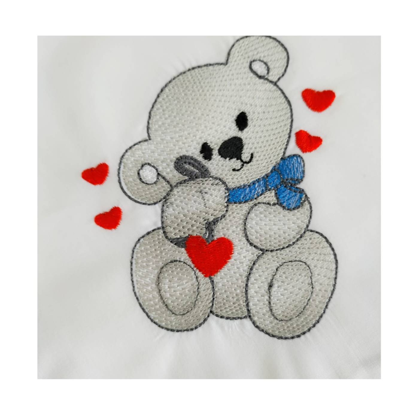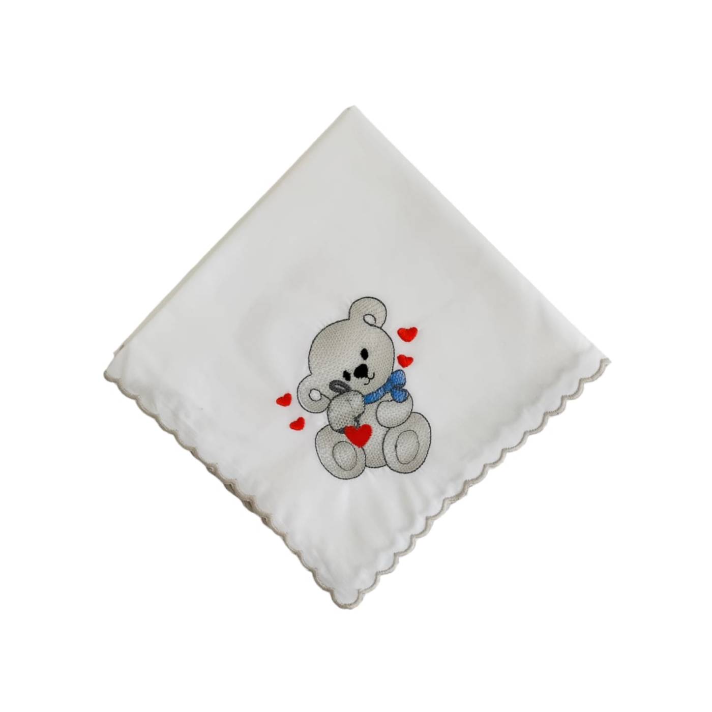 Quadrato in batista di cotone bianco bordato con smerlino grigio con ricamato un tenero orsetto su un angolo. Essendo di cotone biologico risultano estremamente morbido sulla pelle delicata del bambino, traspirante ed assorbente. Utile fin dalle prime ore di vita del bambino e dai molteplici usi: per l'allattamento; come lenzuolino estivo; per asciugare il visino, le manine... del bambino dopo il bagnetto; in estate per le sedute dei seggiolini auto e dei passeggino;, per appoggiarlo sulla spalla della mamma al momento del ruttino...