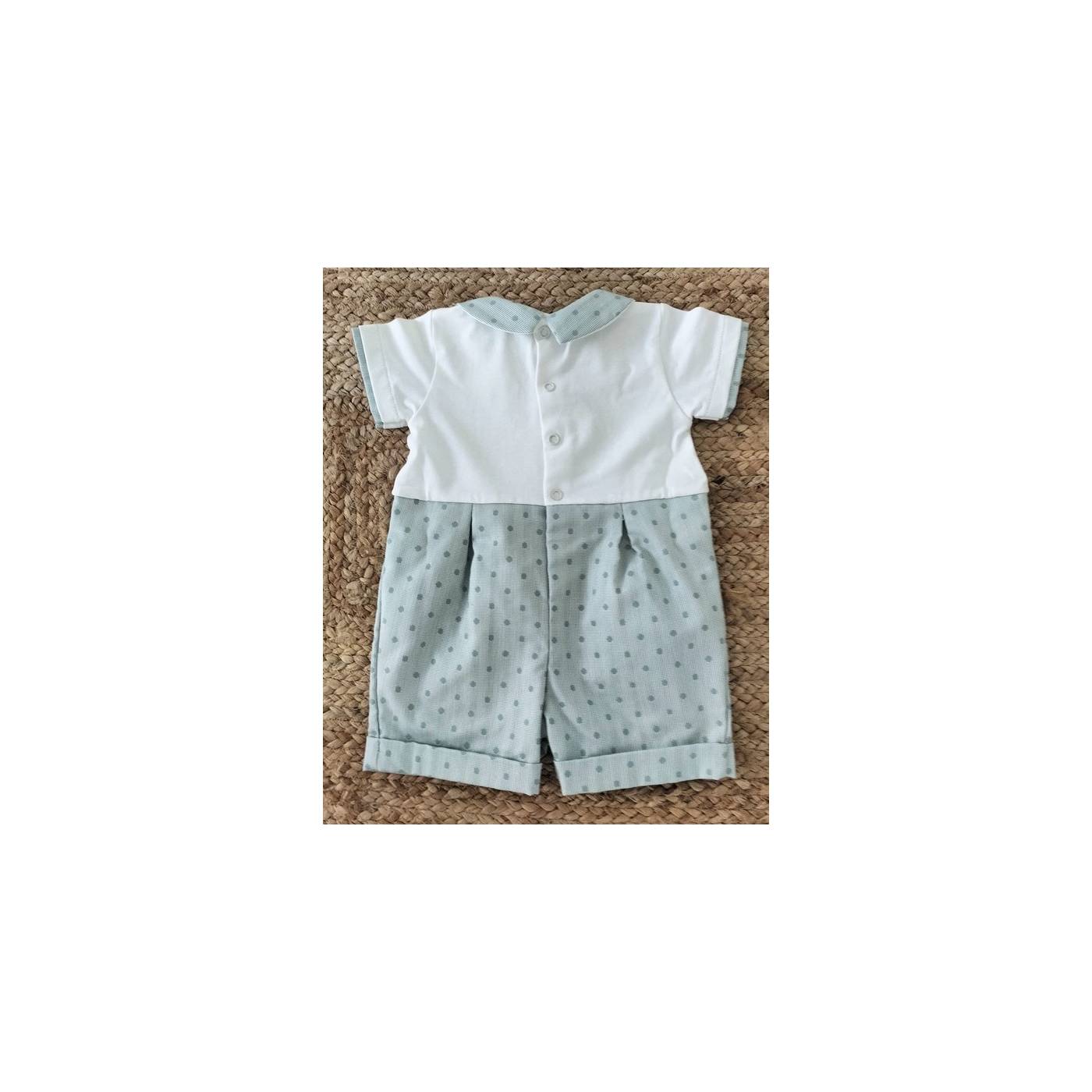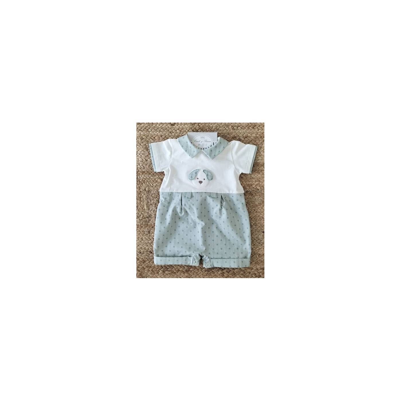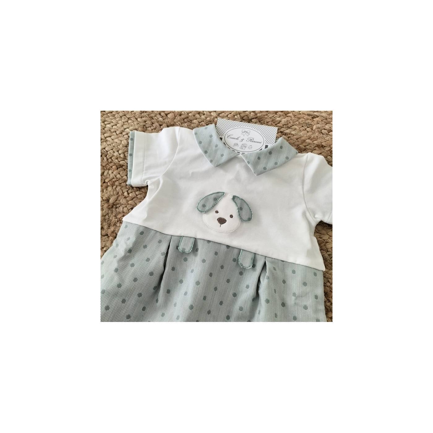 Fresco pagliaccetto in cotone del brand Teto&Tatta. Orsetto ad applique, tessuto verde salvia con pois più scuri.