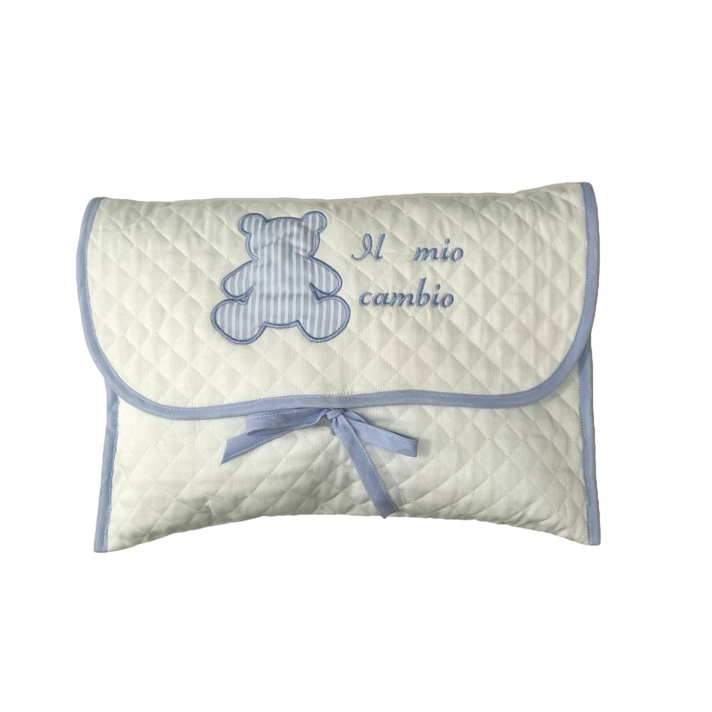 Adatta sia da portare in ospedale per mettere i suoi primi cambi, sia da usare successivamente per contenere il cambio del bambino per le uscite fuori casa. Realizzata in cotone trapuntato bianco riporta nella parte superiore un orsetto ad applique, possibilità di personalizzare col nome.