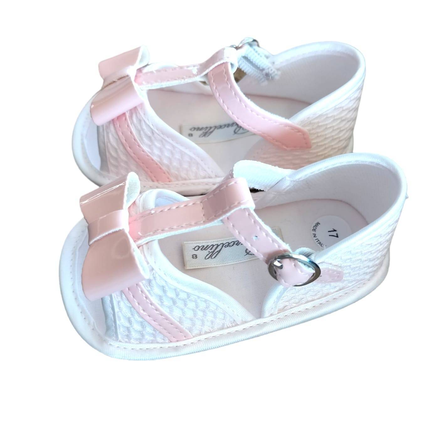Sandaletto neonata bianco bianco e rosa con dettagli in vernice rosa. Chiusura con fibbia. Adatto al periodo estivo.