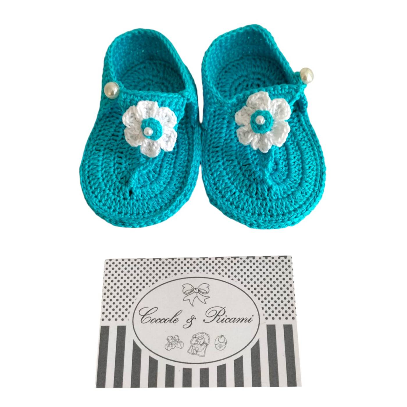 Morbide scarpine culla modello infradito realizzate in cotone all uncinetto.