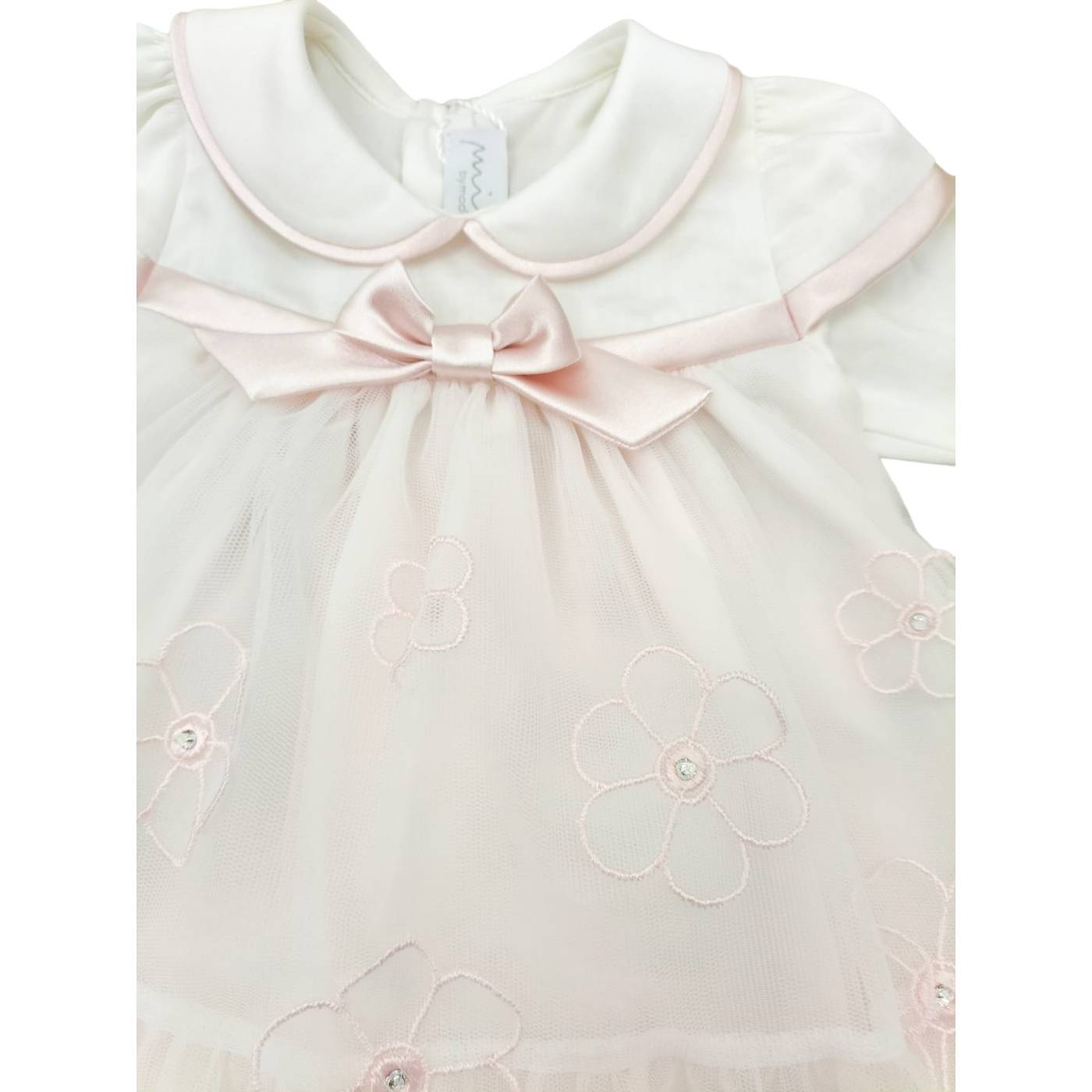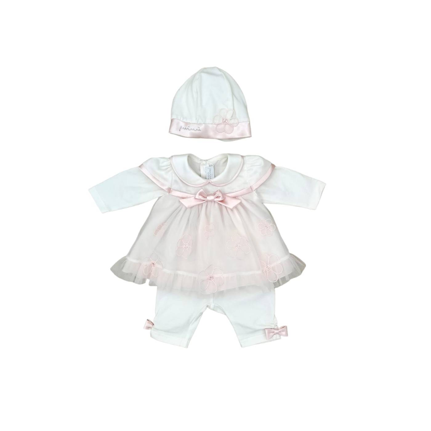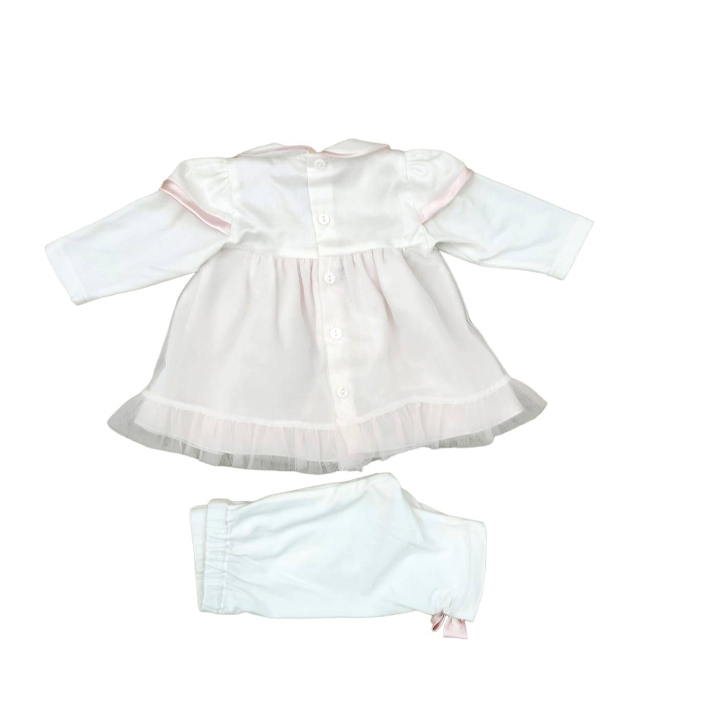 Coprifasce composto da vestina con ghettina bianco latte e dettagli rosa in cotone 1 mese corrispondente a 50-56 centimetri. A manica lunga, collettino bordato col raso, finto cintino accompagnato da un fiocco centrale e la particolarità sta nella parte inferiore, rivestita da un tulle bianco con fiori in rilievo, quest'ultimo bordati da un ricamo rosa con al centro un brillantino. In abbinamento la cuffiettta indispensabile sin dalle prime ore di vita della bambina. Adatto per i primissimi giorni di via della bambina che nasce in estate ma anche utilizzabile in primavera ed autunno.