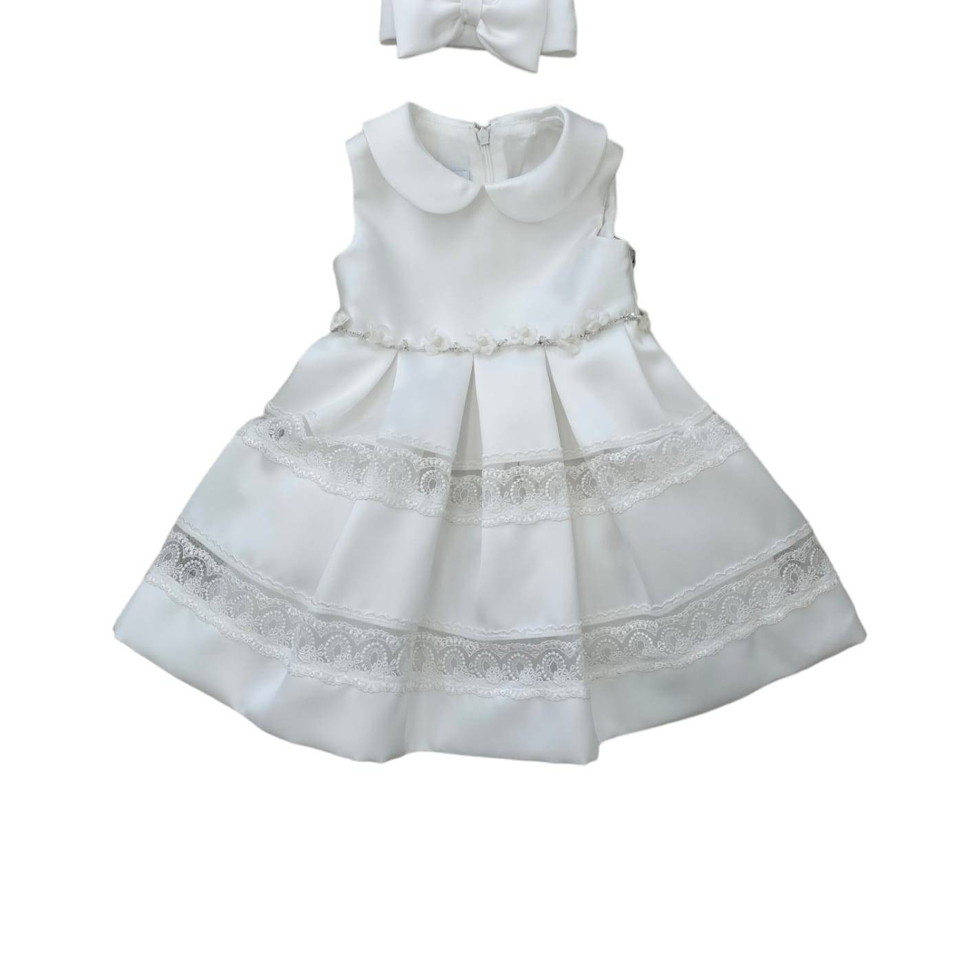 Abito elegante da battesimo per bambina misura 12 mesi bianco latte realizzato con tessuto effetto mikado. Smanicato con collettino e corpetto semplice, in vita fermato da fiorellini e piccoli punti luce, la particolarità di questo capa sta nella gonna dove è ornata da due giri di un raffinato merletto. La fascetta è realizzata con lo stesso tessuto dell'abito semplicemente con un bel fiocco.