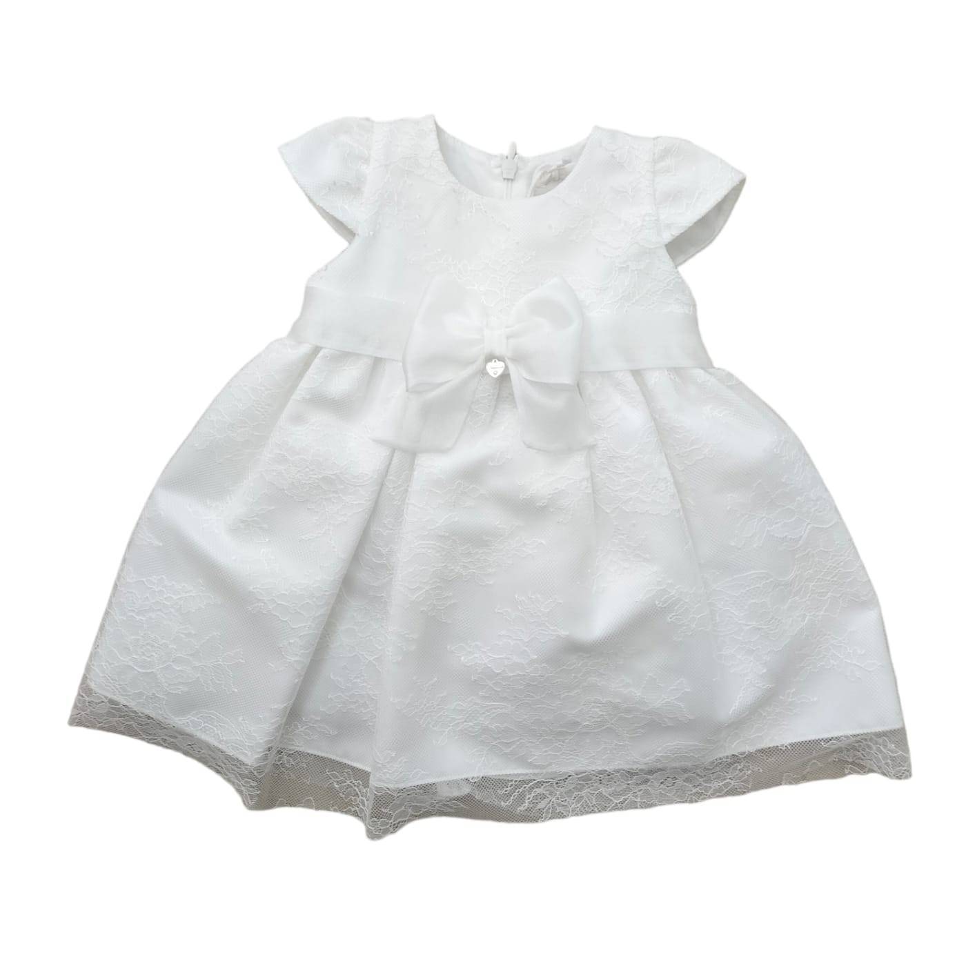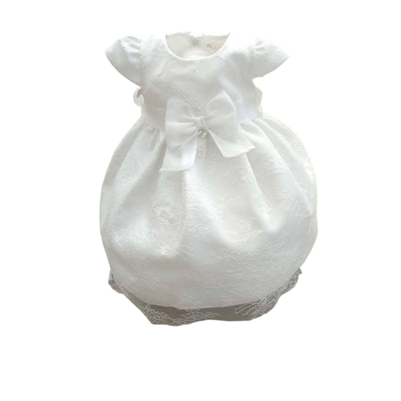 Elegante abito bambina neonato interamente coperto da un fine merletto bianco, in vita cintino con fiocco in organza. Adatto sia al battesimo che alle cerimonia nel periodo estivo. Misura 3 mesi.