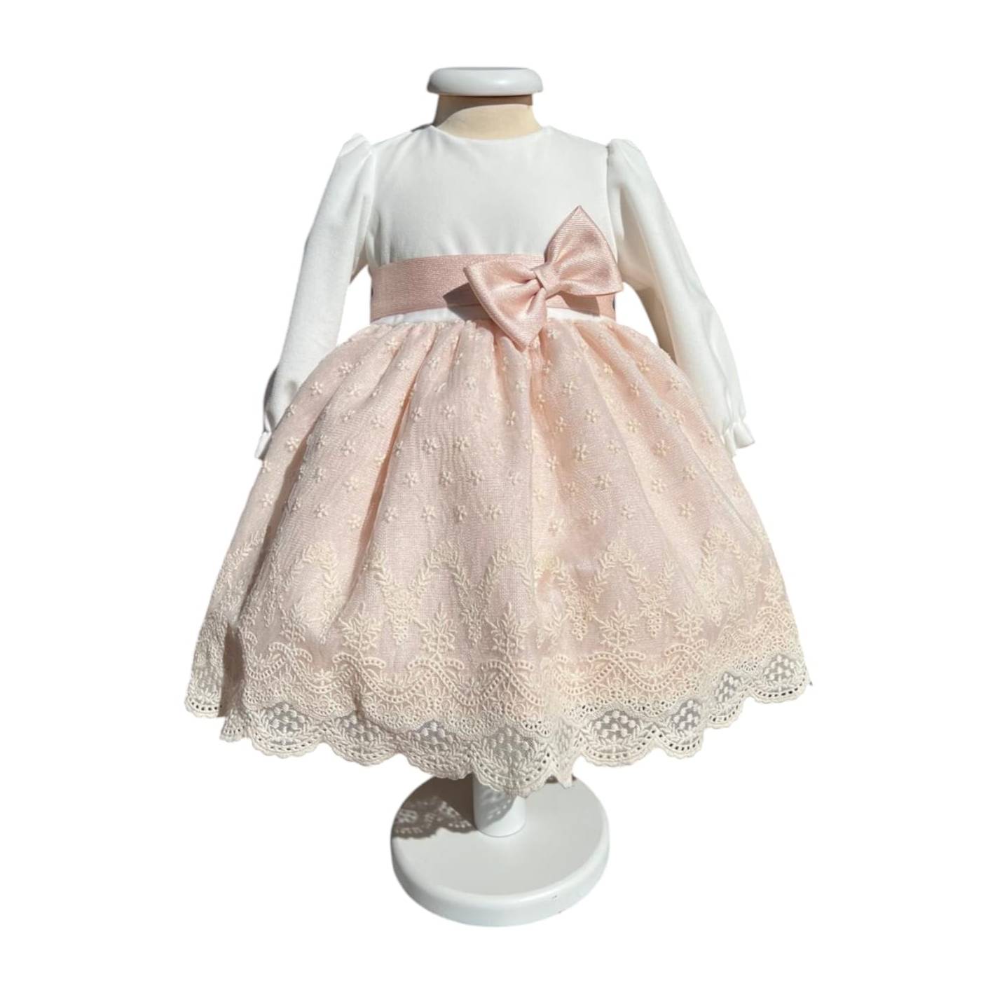 Ideale per le cerimonie ed i battesimi in autunno ed inverno grazie alla manichetta lunga in morbido velluto bianco latte , lo stesso tessuto è usato anche per il corpetto. In vita un cintino color rosa effetto lurex e lateralmente un fiocchetto, lo stesso che ritroviamo sulla fascetta. La parte inferiore è composta da uno strato di tulle ricamato beige con trasparenza rosa sotto.