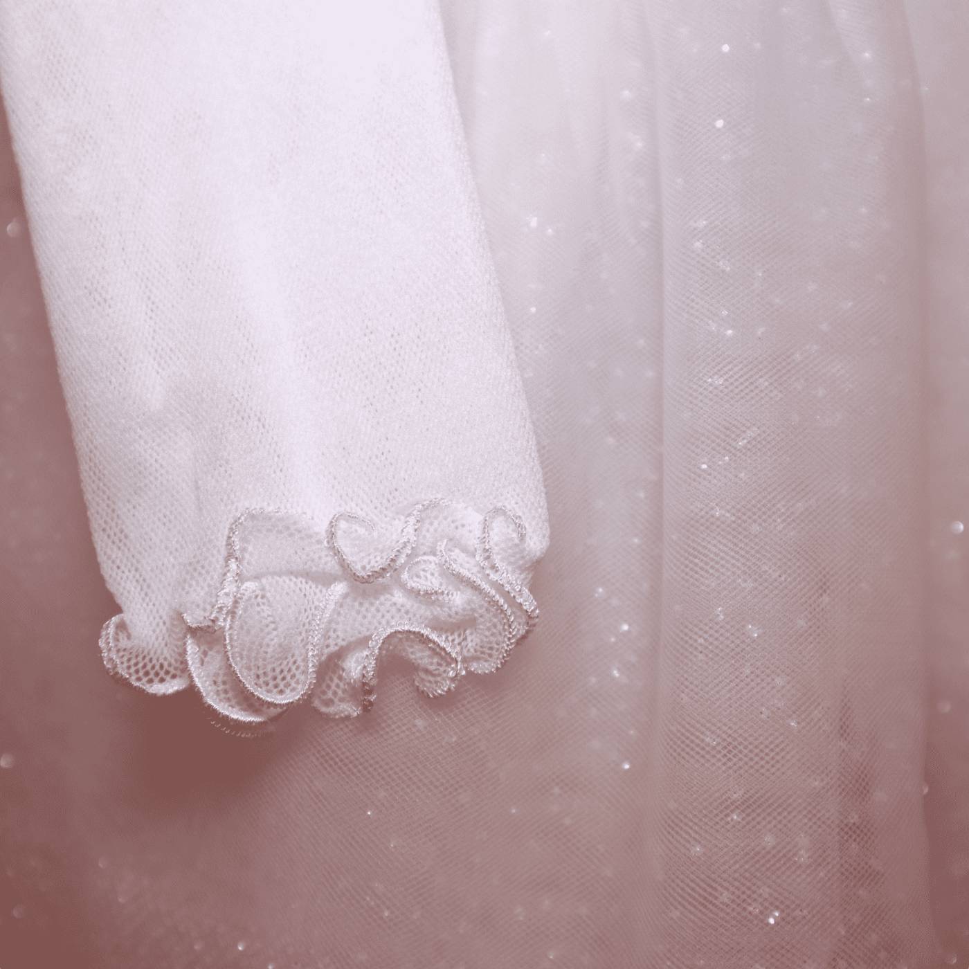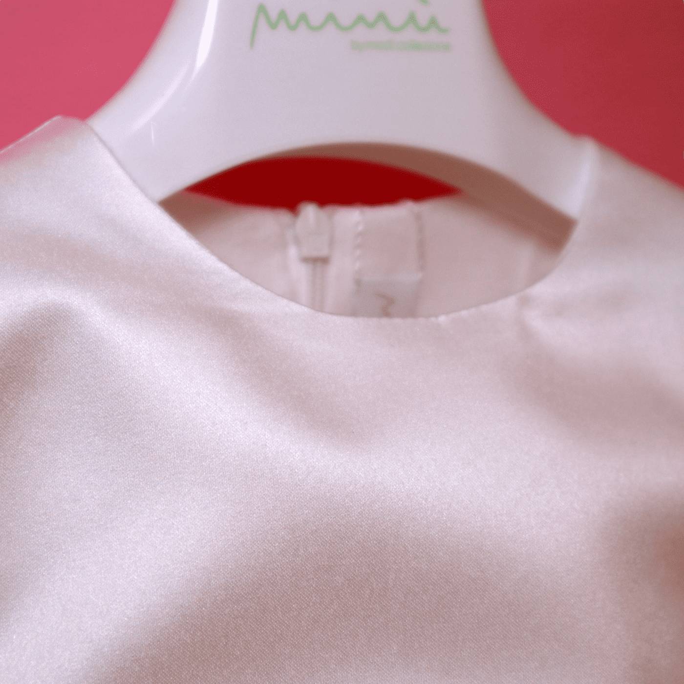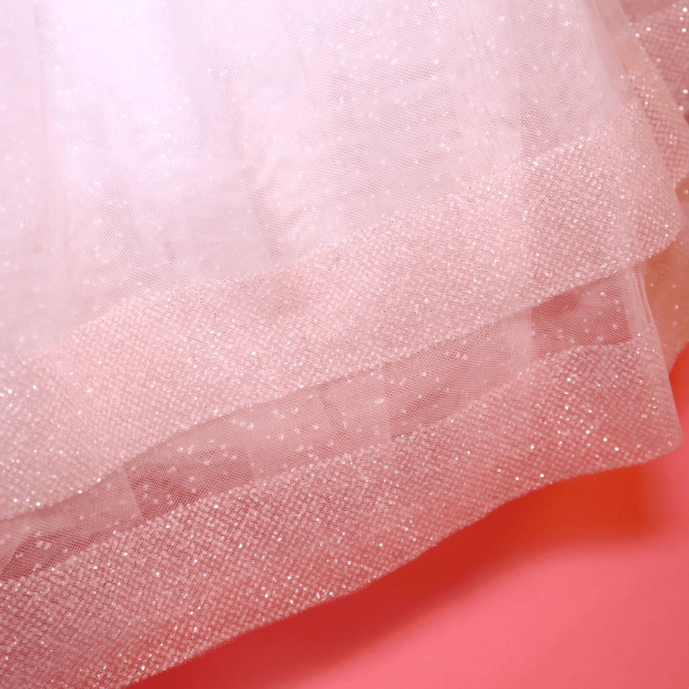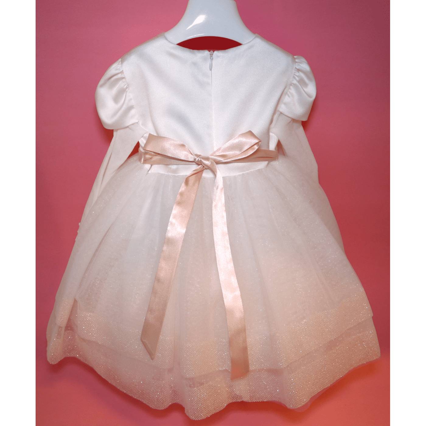 Sorio corpetto in raso di seta bianco latte a mezza manica a cui proseguono le manichette in tulle che creano una trasparenza sulle braccia della bambina. In vita il cintino in raso rosa pesco in contrasto è accompagnato da un fiocchetto che ritroviamo nella fascetta per capelli. La particolarita è nella gonna, che è composta da diversi strati in tulle glitterati che donano lucentezza al capo e sulla parte finale del vestito due bordure sempre in tulle glitterate rosa pesco.