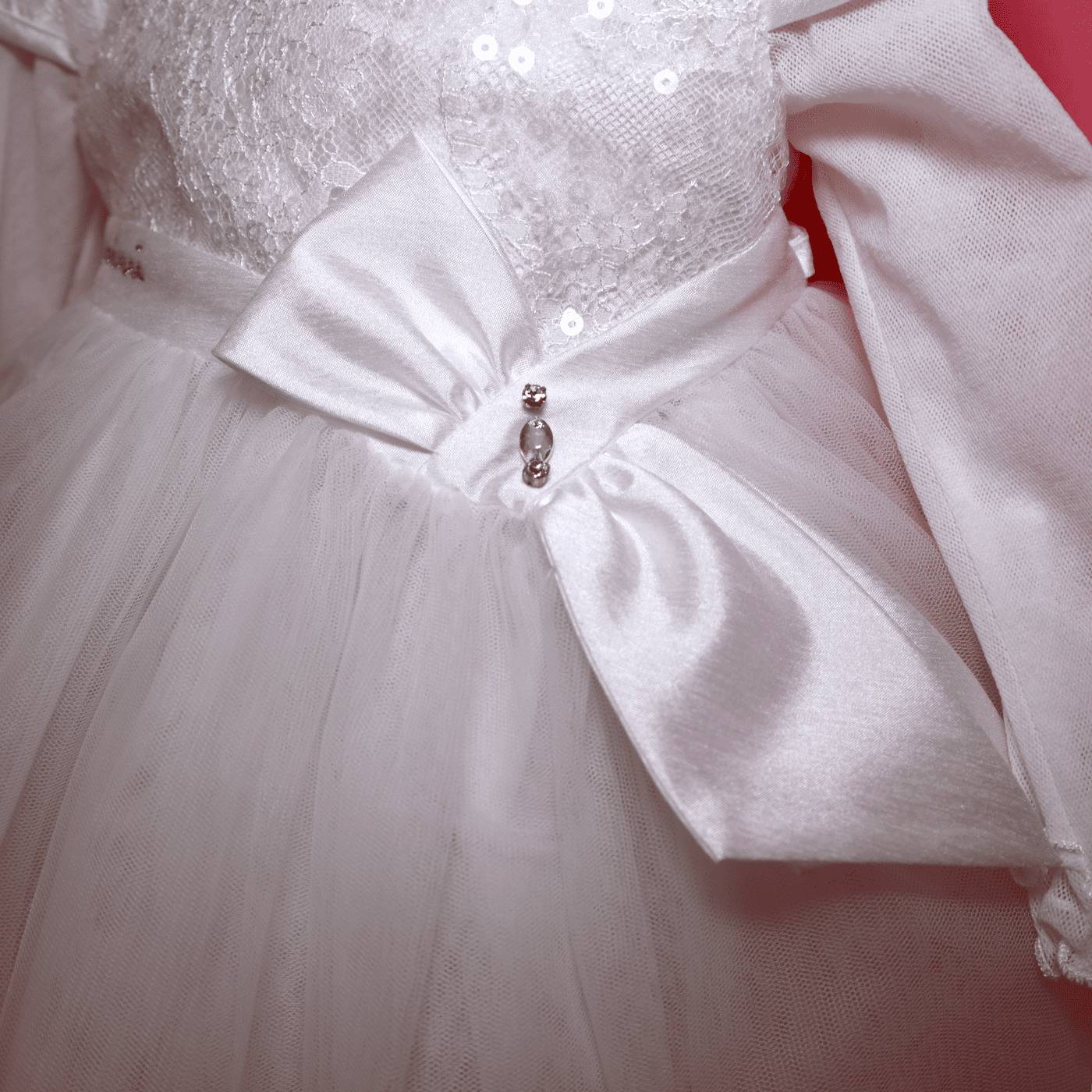 Abito da Battesimo per bambina, con corpetto rivestito da un fine pizzo con applicazione di qualche paillettes trasparente che dona ancora più luminosità al capo, colletto e finto cintino in vita con fiocco dettagliato da brillantini al centro  sono in shantung di seta, prosegue la gonna composta da vari strati di tulle e bordata nella parte finale da un raffinato pizzo.